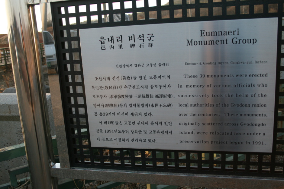 읍내리 현 교동양조장 앞에서부터 서쪽으로 수십여개의 비석이 늘어서 있던 곳을 이름하여 비석거리라고 전해져 왔다. 이 비석들은 쓰러지고 훼손되어 멸실될 우려가 있었다. 1970년대 새마을 사업이 한창일 때 교동의 지난날의 역사를 정립한다는 뜻에서 옛 교동의 관문이었던 남산포길 옆에다 이전 정립하였다.