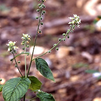 | 잎은 대생하며 좁은 난형 또는 난상 긴 타원형이고 끝이 뾰족하며 밑부분이 둥글거나 얕은 심장저 또는 예저이고 길이 4-14cm, 폭 2-5cm로서 가장자리에 점으로 그치는 희미한 톱니와 더불어 잔털이 있으며 엽병이 엽신보다 짧고 길이 3-5cm로서 거의 털이 없다. 표면은 맥줄에 다소 털이 있고 뒷면은 털이 없다. | |