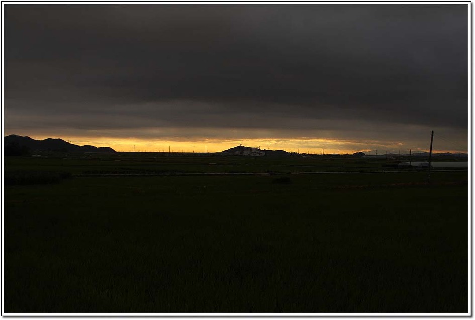 ▽ 해가 뉘엿 넘어갈 때인가, 먹구름 사이로 저녁 노을이 환상을 불러 일으킨다.