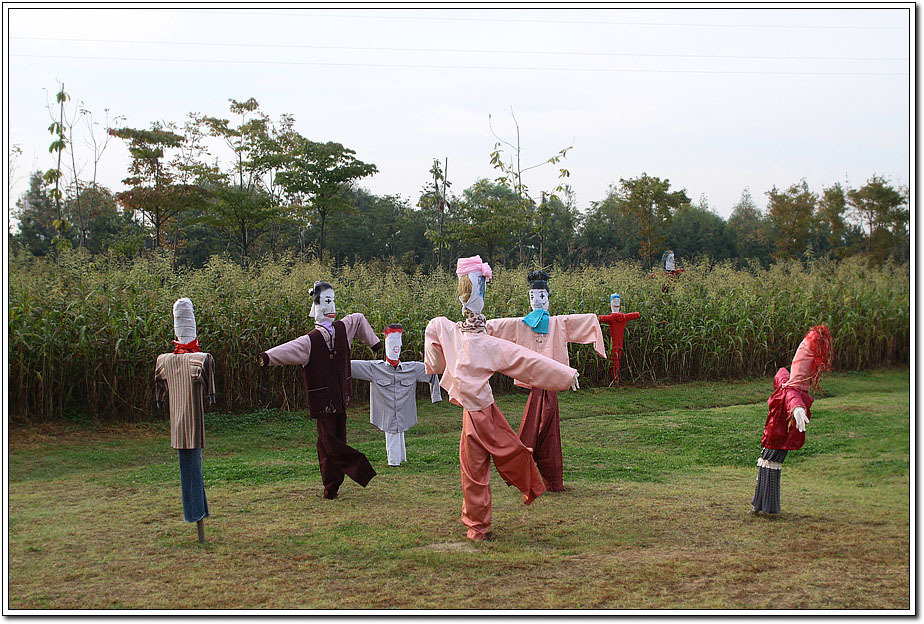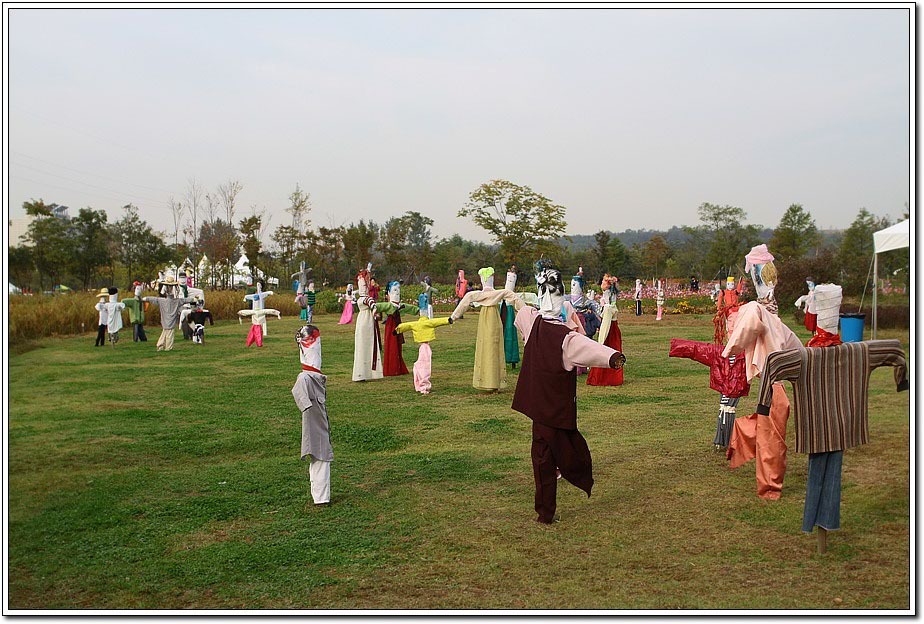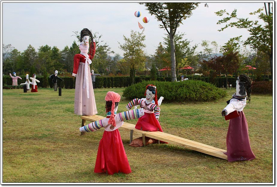 ▽ 각종 우스게스런 모습의 허수아비들로 장사진을 이룬다. 우리 전통민속 놀이인 강강수월래, 씨름, 널뛰기, 깡통돌리기등이 재현되었다.