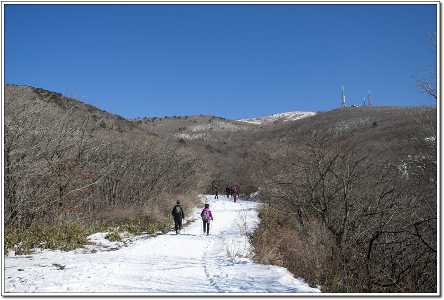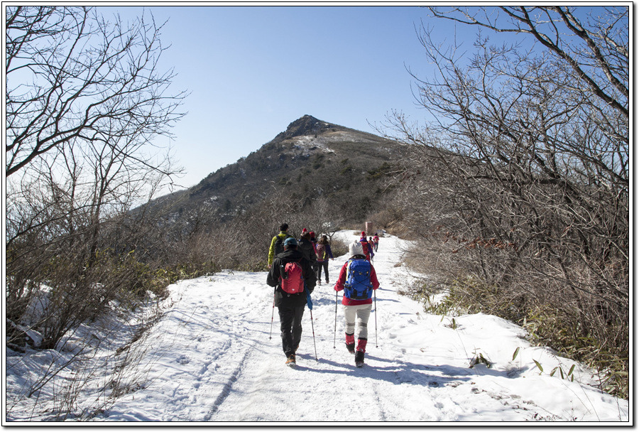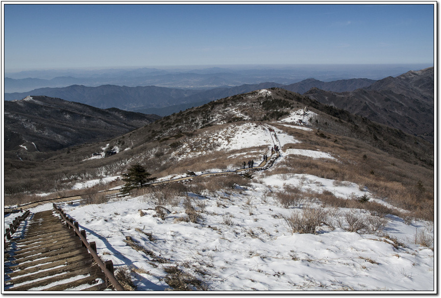 ▼ 철쭉군락지로 잘 알려진 <바래봉1,165m>이 흰눈으로 살짝 덮여있고 아득히 병풍처럼 <남덕유산1,507m>줄기가 펼쳐져 있다.