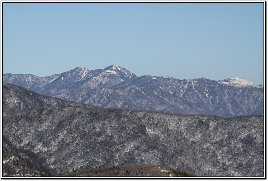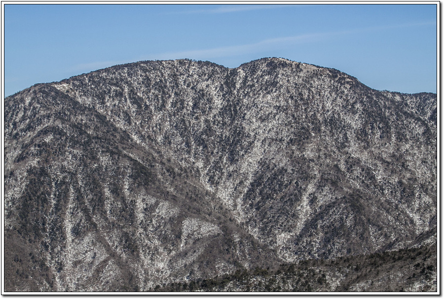 ▼ 눈으로 살짝 덮여진 앞 봉우리 <바래봉1,165m>과 뒷편 멀리 흰눈의<남덕유산1,507m>