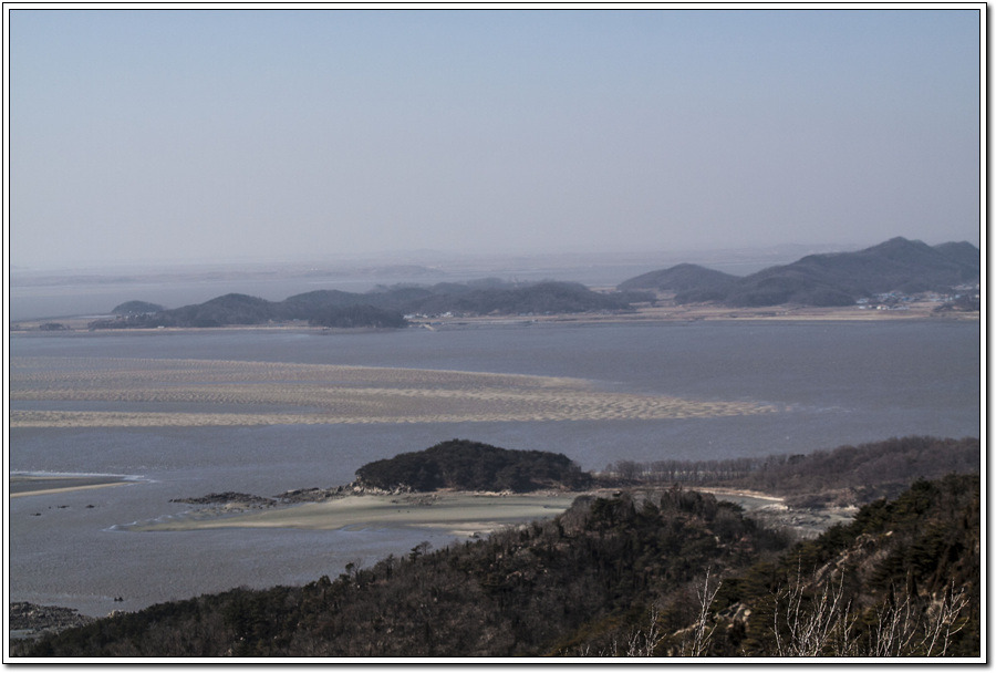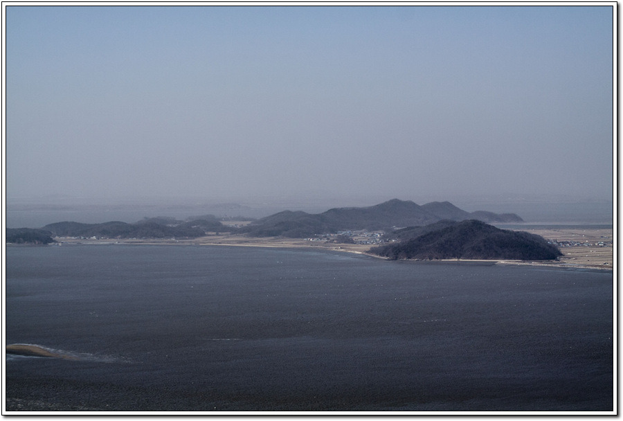 ▼ 강화 내가면의 국수산(193m)과 황청포구, 왼쪽 끝 아득히 길상산(336m)과 가운데 뾰족한 초피산(242m), 오른쪽 아득히 보이는 마니산(469m)