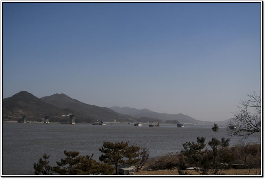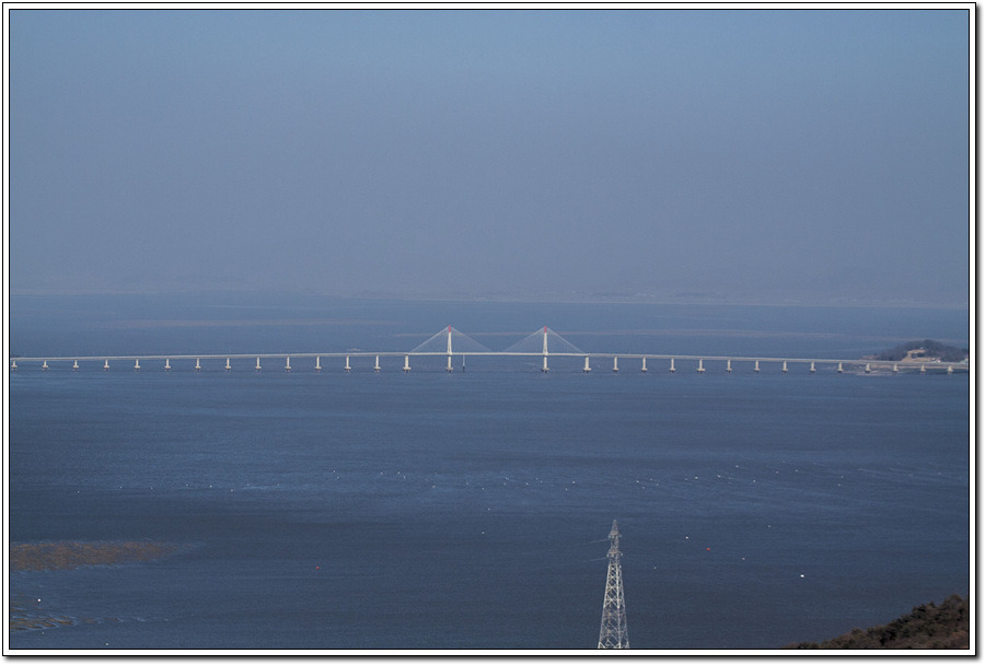 ▼ 상주산에서 본 남녘...건설중인 삼산연륙교 왼쪽 산이 국수산, 아득히 보이는 마니산, 오른쪽으로 해명산 낙가산, 상봉산으로 이어지는 능선줄기이다.