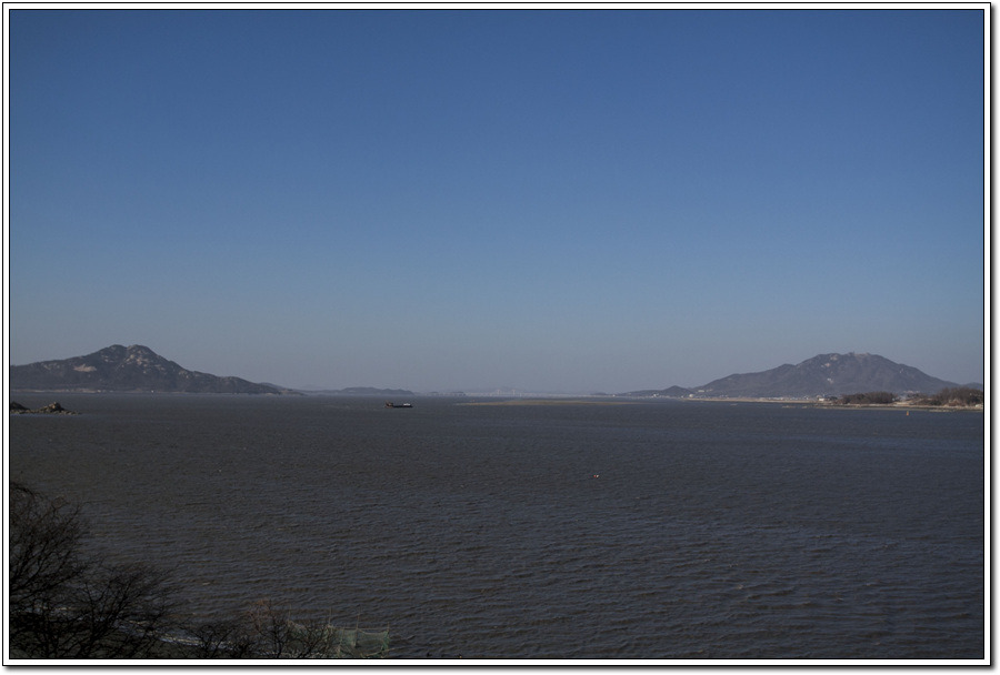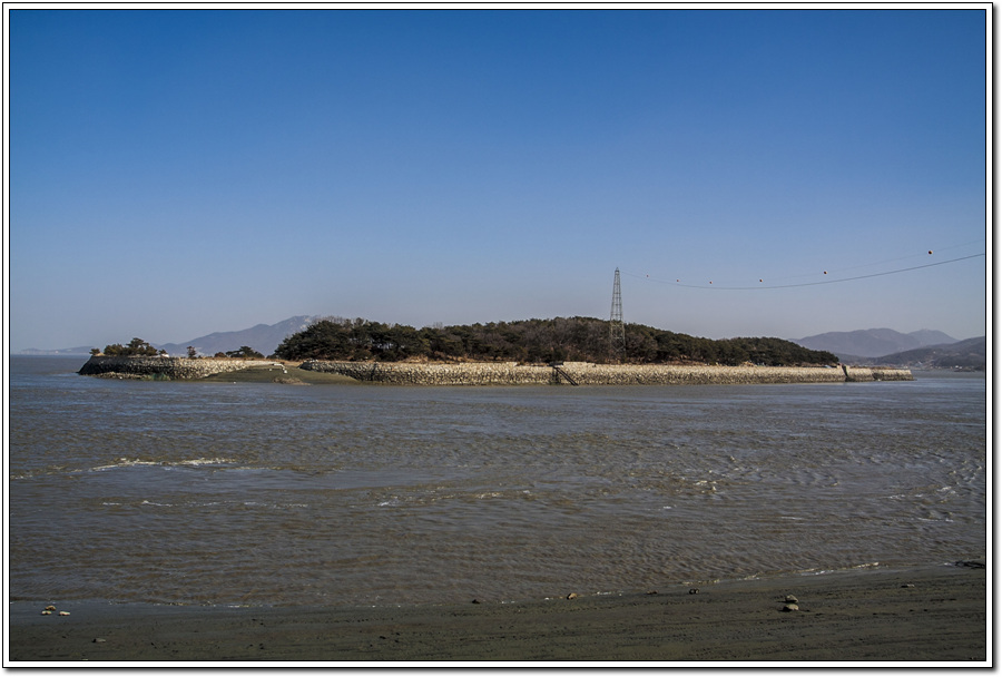 ▼ 바로앞의 작은 섬이 기장섬이다. 1970년대 초반까지만 해도 한 두가구가 살고 있었으나 지금은 무인도이다. 그 뒤로 보이는 곳이 교동의 죽산포이며 동산리이다.