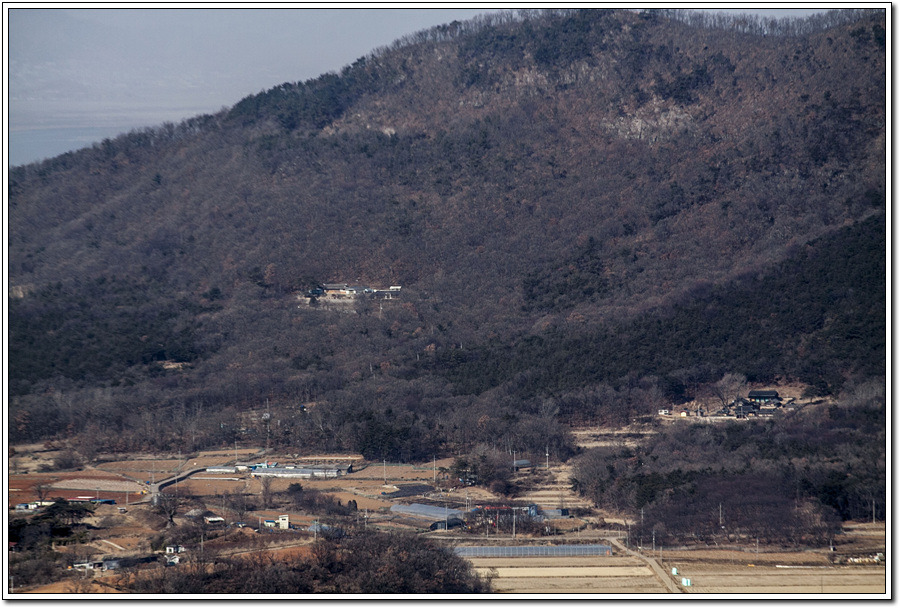 ▼ 양갑리의 북갑마을 뒤로 무학리, 우측 고양이산