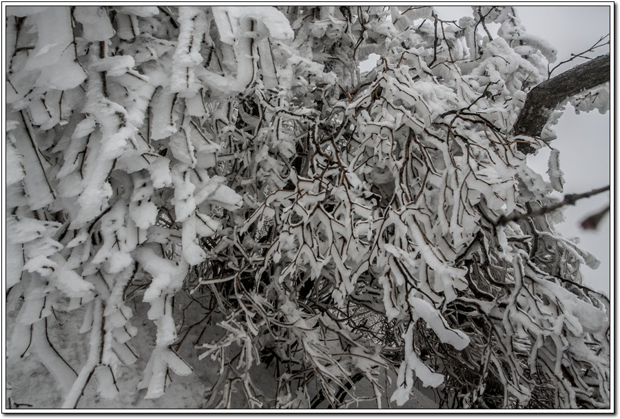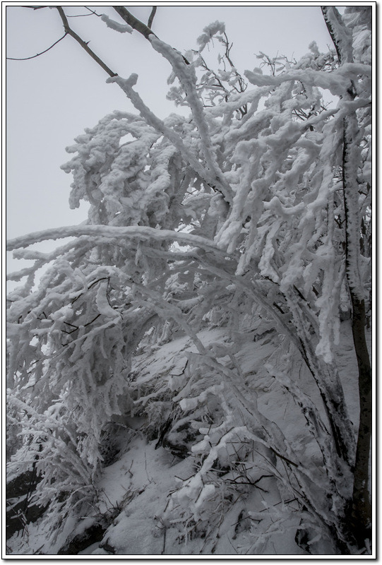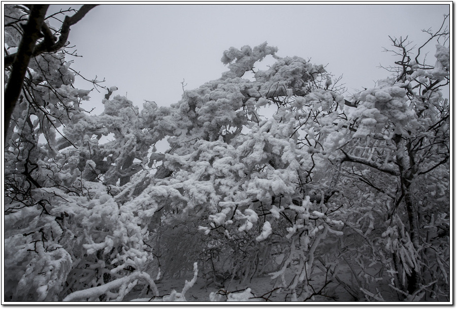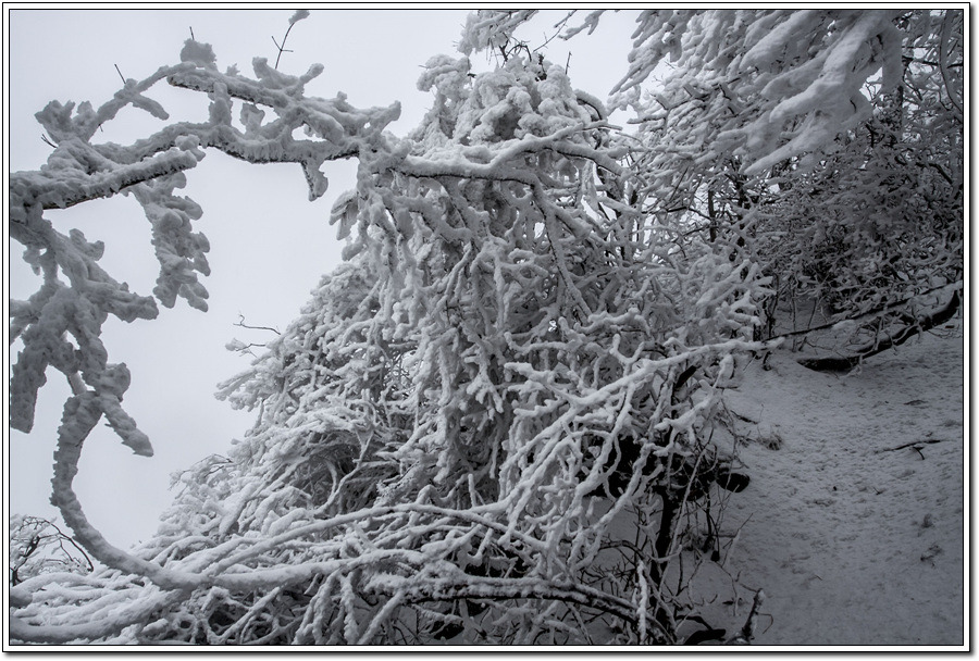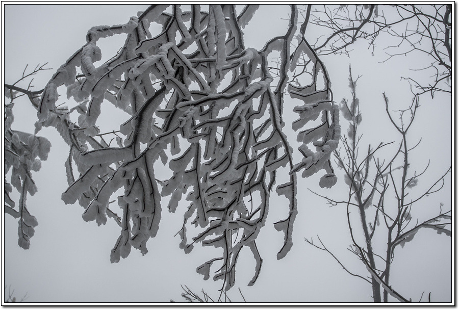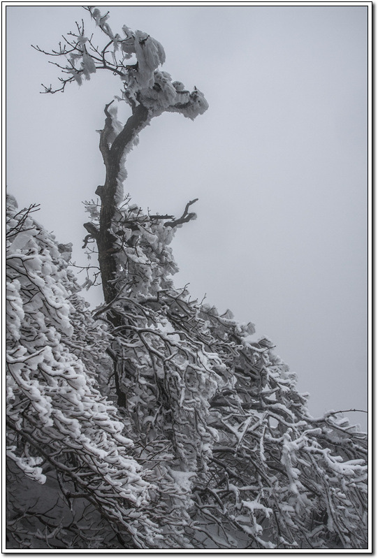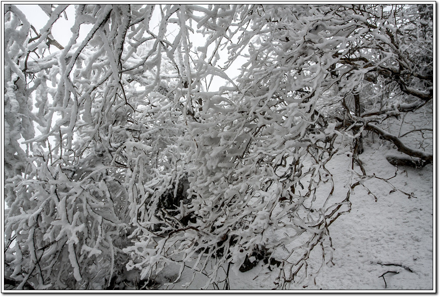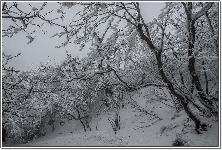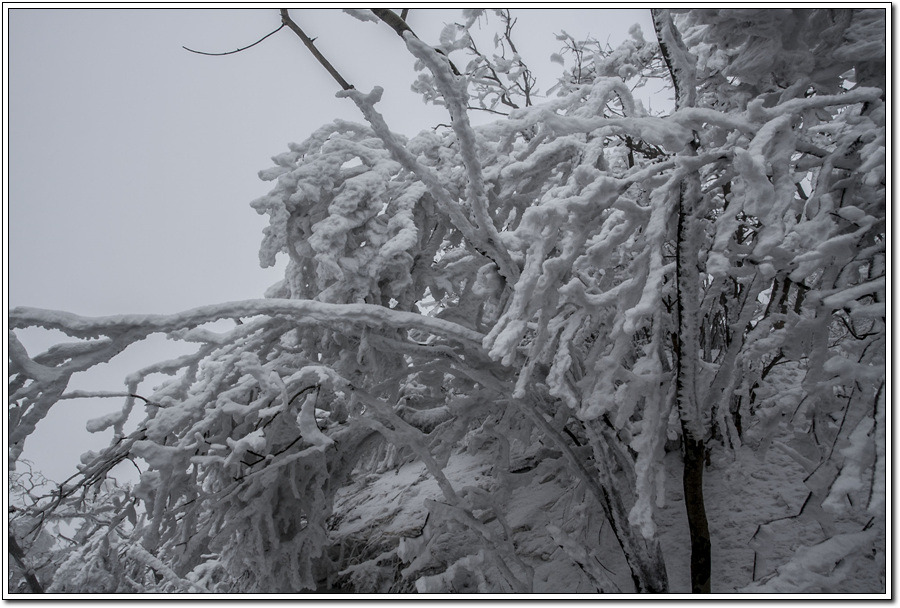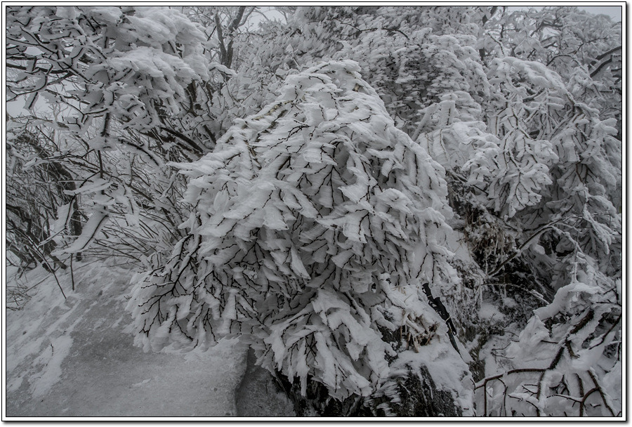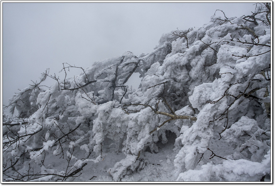 그래도 설연휴 며칠간 기름진 음식의 체지방을 빼는 효과는 있지 않겠냐는 위안을 삼고 한발 한발 내딛기를 얼마 후 기온 차로 인해 비가 진눈깨비로, 싸래기눈으로 점점 변하는가 싶더니 정상 가까이에 나타나는 상고대와 눈꽃의 조화가 장난이 아니다.