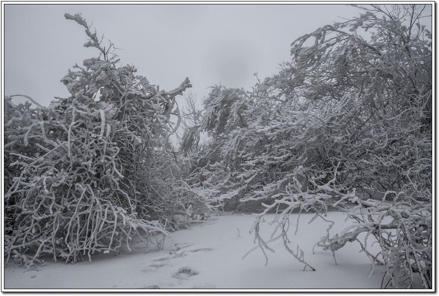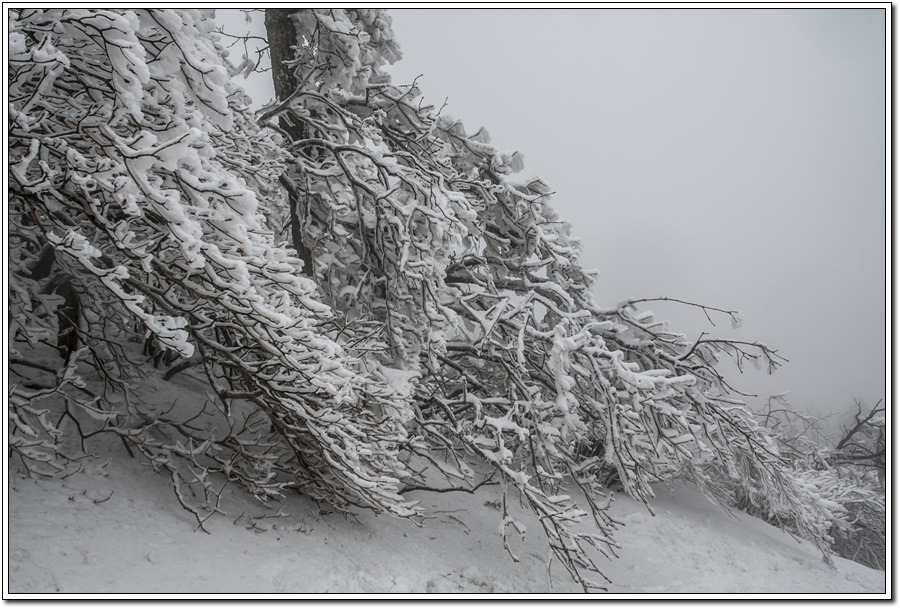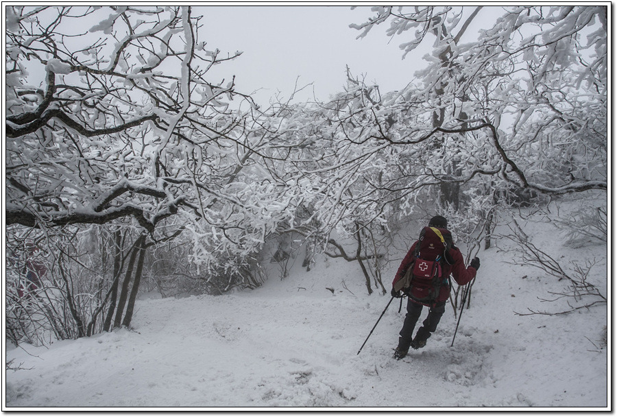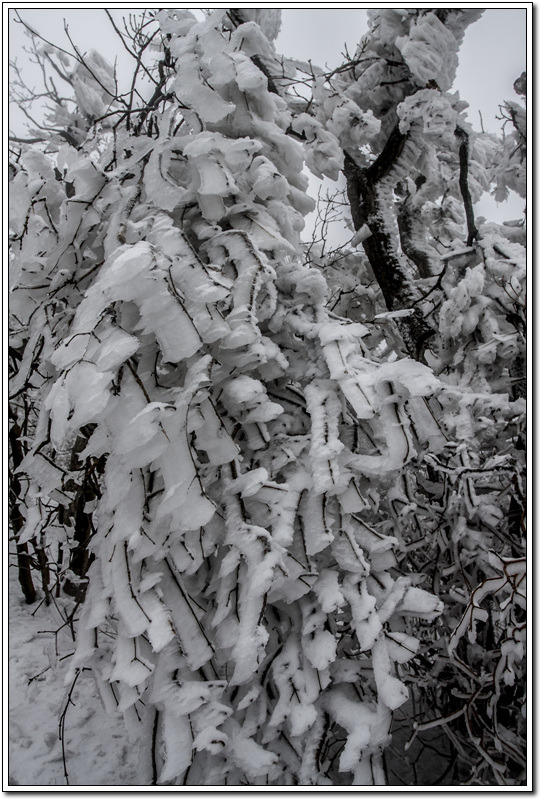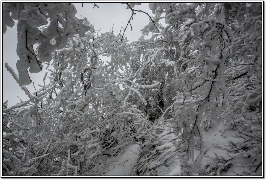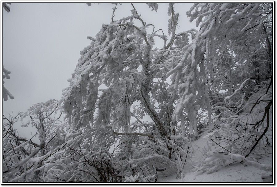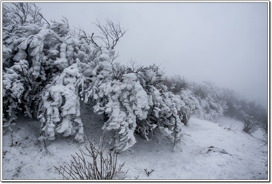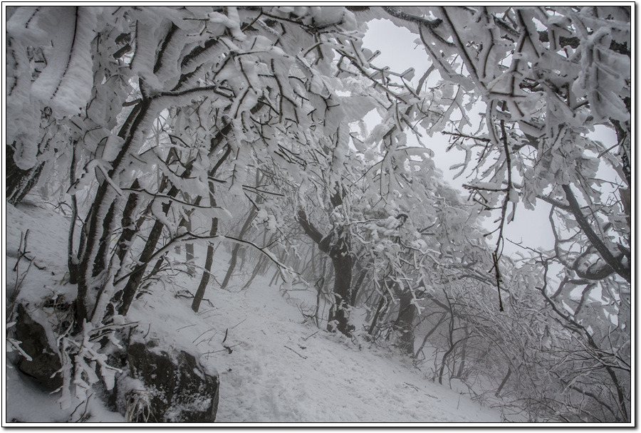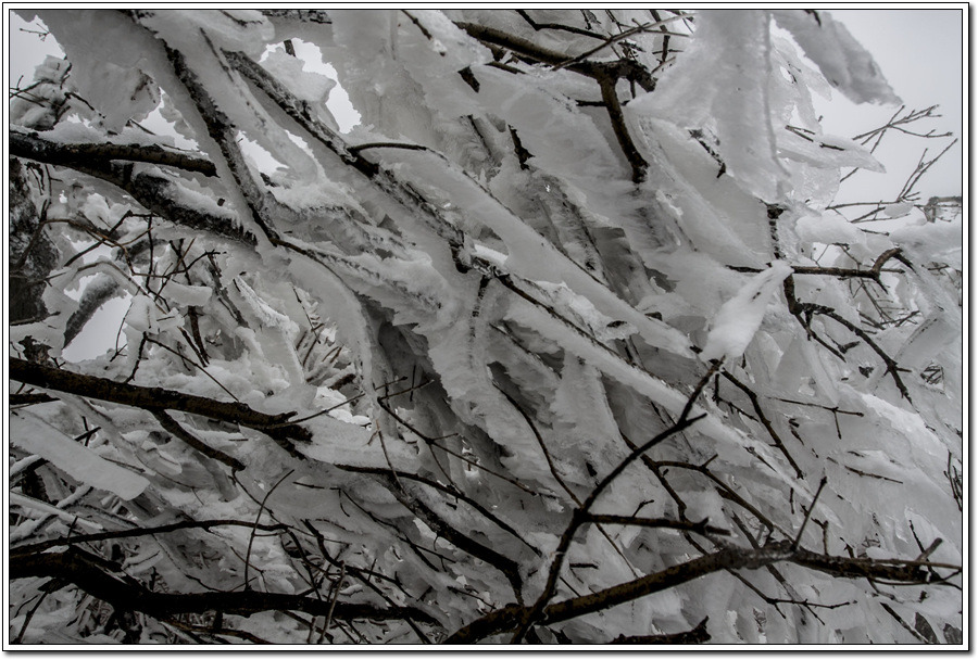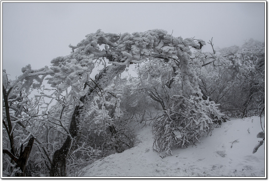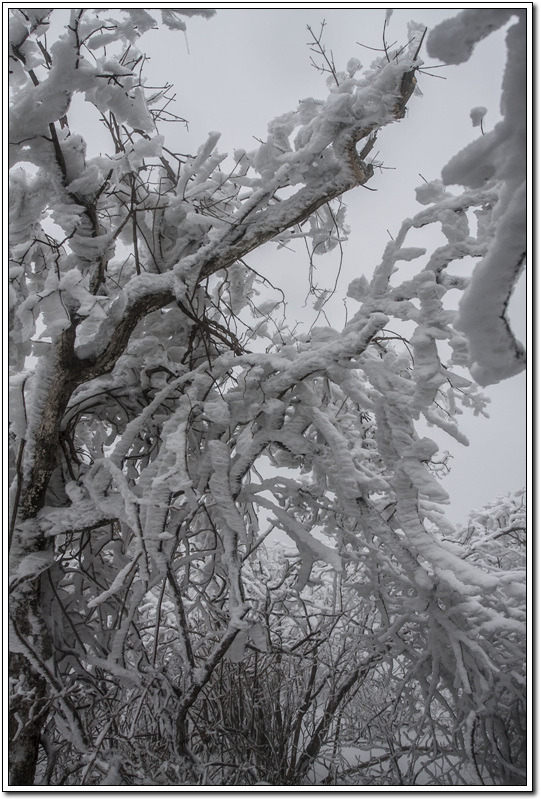 그래도 설연휴 며칠간 기름진 음식의 체지방을 빼는 효과는 있지 않겠냐는 위안을 삼고 한발 한발 내딛기를 얼마 후 기온 차로 인해 비가 진눈깨비로, 싸래기눈으로 점점 변하는가 싶더니 정상 가까이에 나타나는 상고대와 눈꽃의 조화가 장난이 아니다.