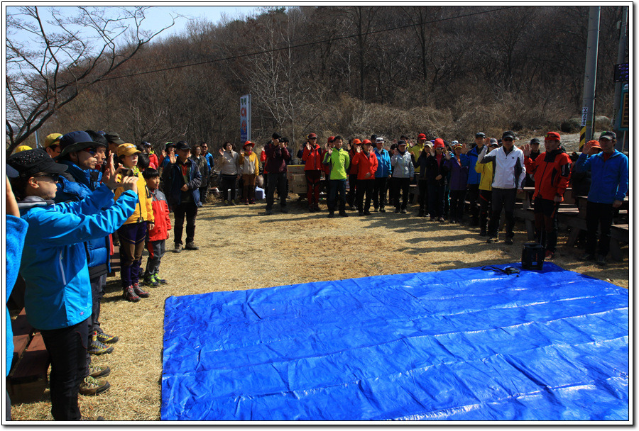 ▼ 산악회 회원 90여명이 버스 두대로 참석했다. 느닷없는 준비체조 부탁을 받은 이몸...