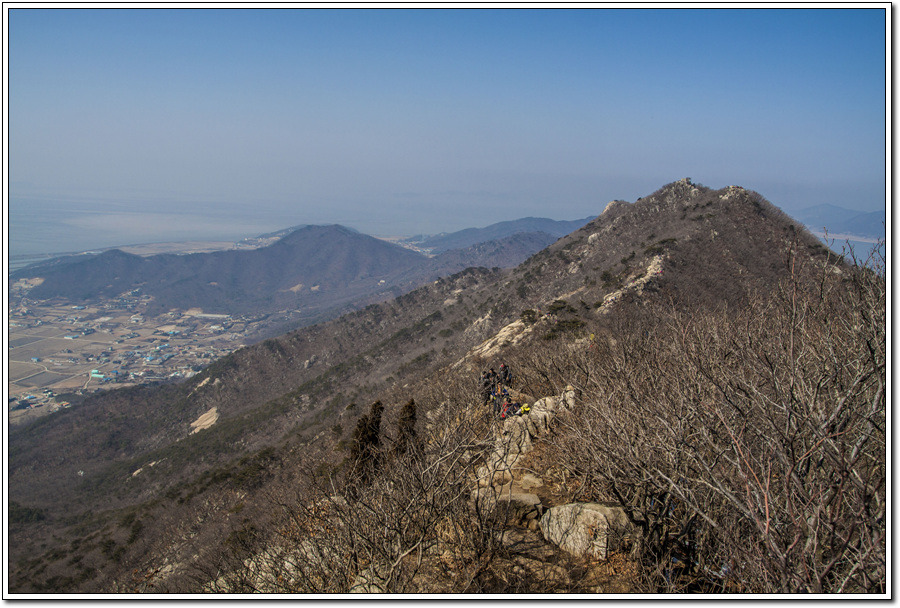 ▼ 이쯤에서 왼편으로 살짝 석모도가 보이고 아득히 상주산, 황청리의 국수산, 덕산, 그 뒤로 별립산, 중간의 진강산이 조망된다.