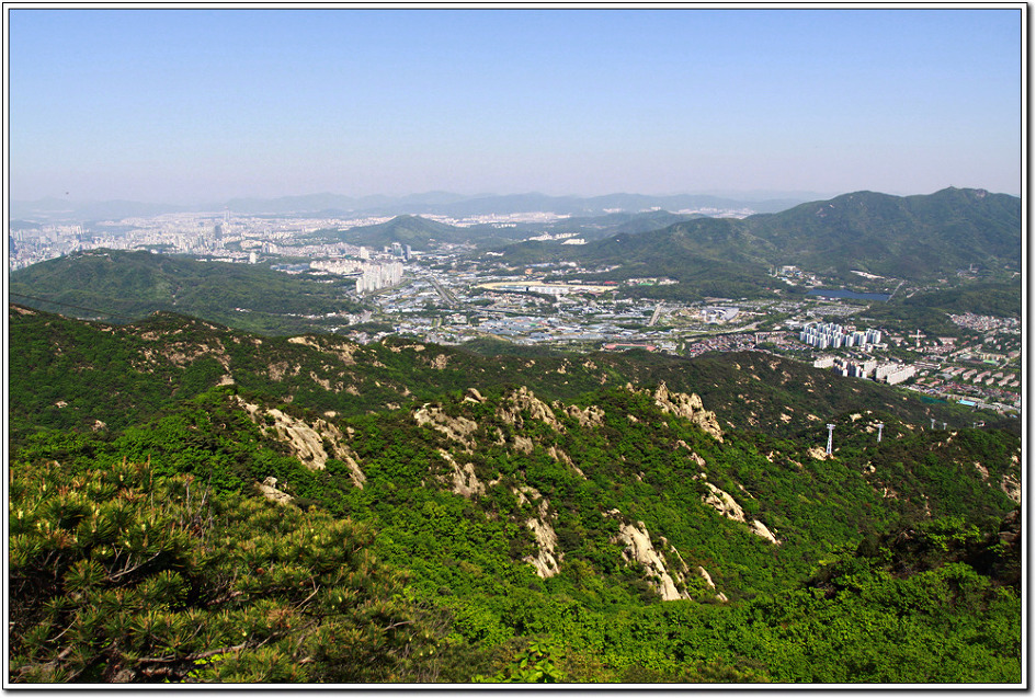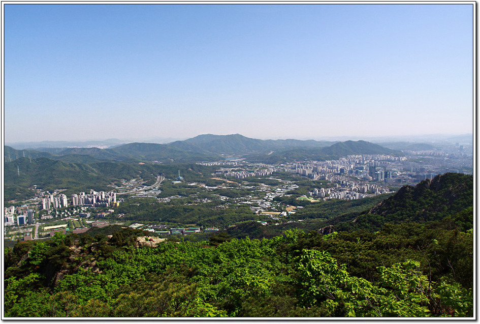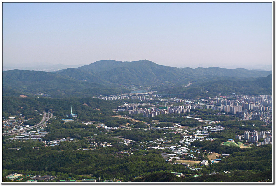 ▼ 멀리 광교산과 오른편 모락산과 안양시내, 그리고 바로 아래 과천 정부청사가 눈에 들어 온다.