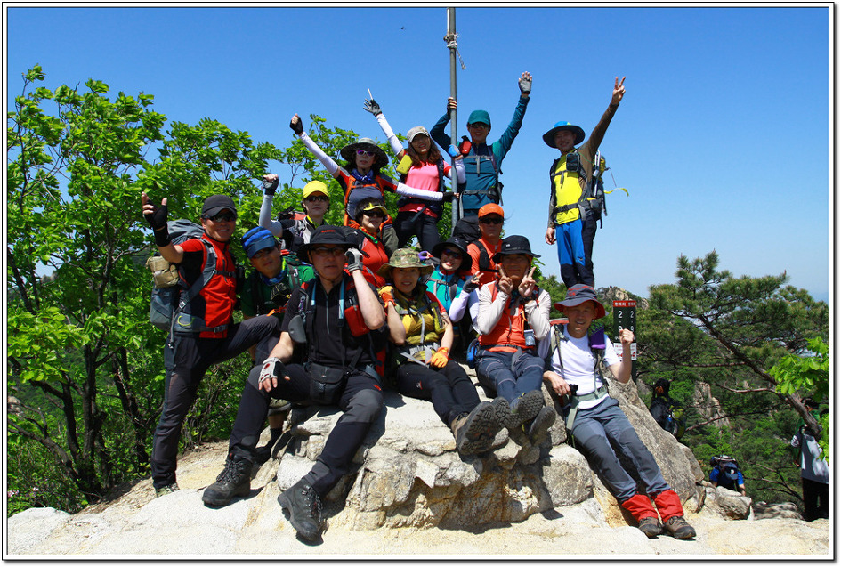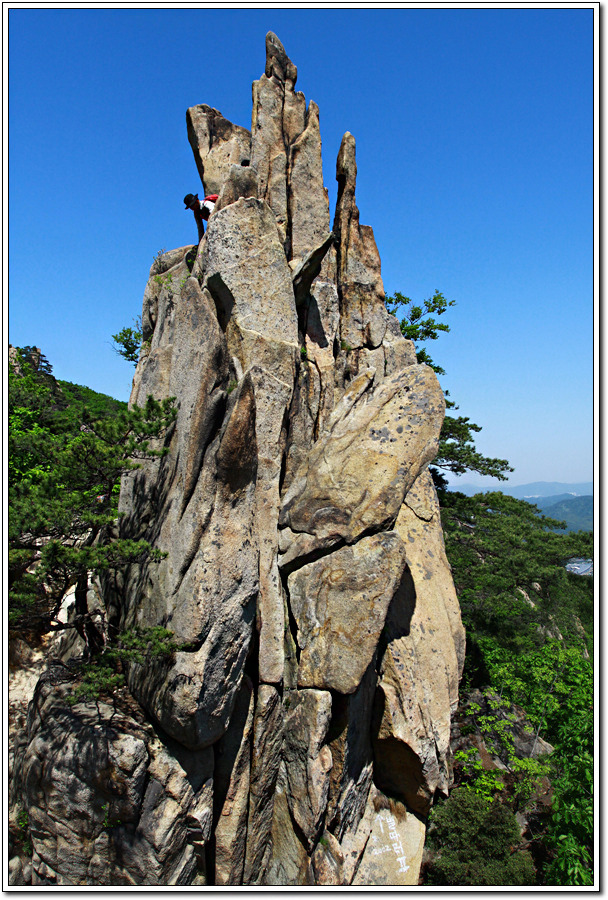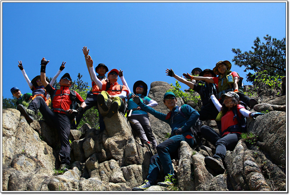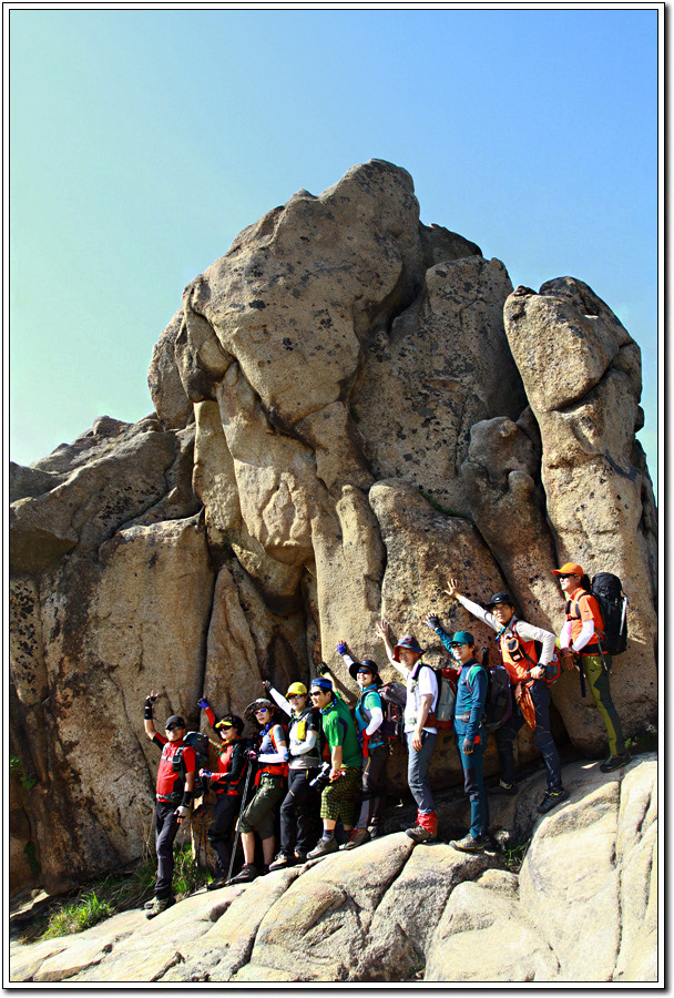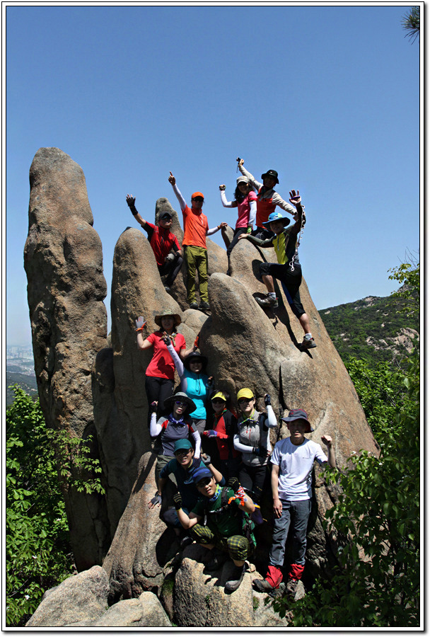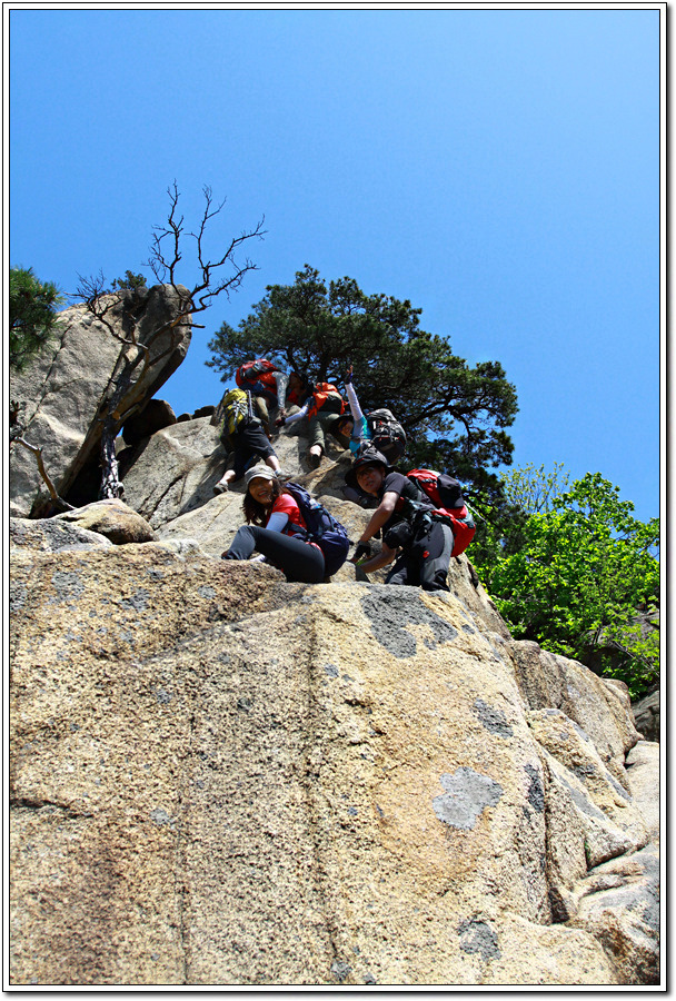 ▼ 어느 정도 오르니 해산바위가 먼저 반긴다. 그새 회원들은 획~ 바위에 올랐다.