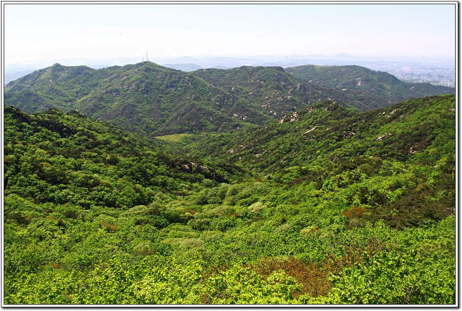 ▼ 지나온 길을 뒤돌아 보니 시원하게 펼쳐진 신록이 싱그럽다. 오른편 아득히 수리산이 보인다.