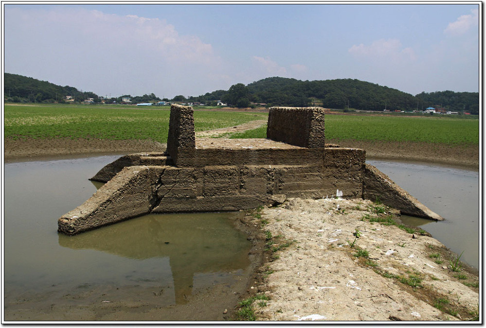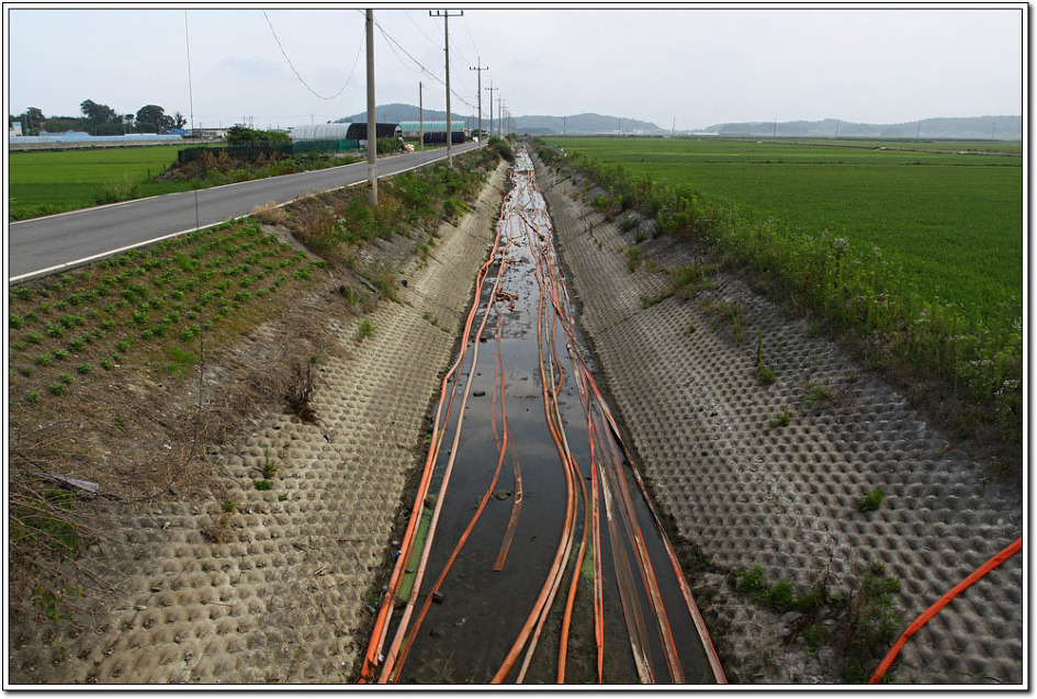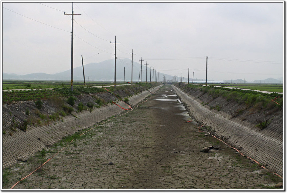 ▼ 바닷가 근방의 수로는 만조시 닫힌 수문틈으로 역류된 바닷물이 유입되어 염분이 있는 물을 끌어 들였다가 벼가 죽는 피해도 입는다.