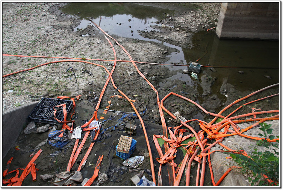 ▼ 생존경쟁의 현장인 호스의 모습, 호스도 이젠 쓸모가 없어져 모터펌프는 없다.