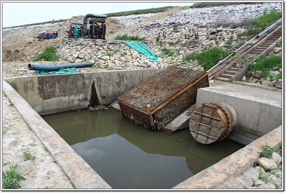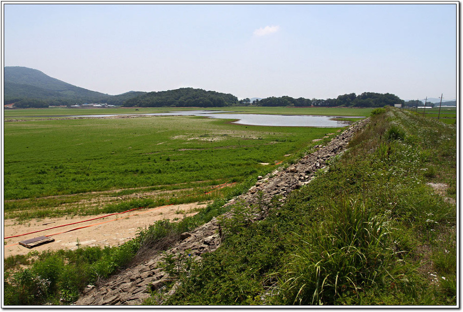 ▼ 제방뚝 하류에는 지난번 비로 약간의 물줄기가 보이긴 하지만 이쪽으로 배수시설도 없고 물 공급을 할 만한 물의 양도 아니다.