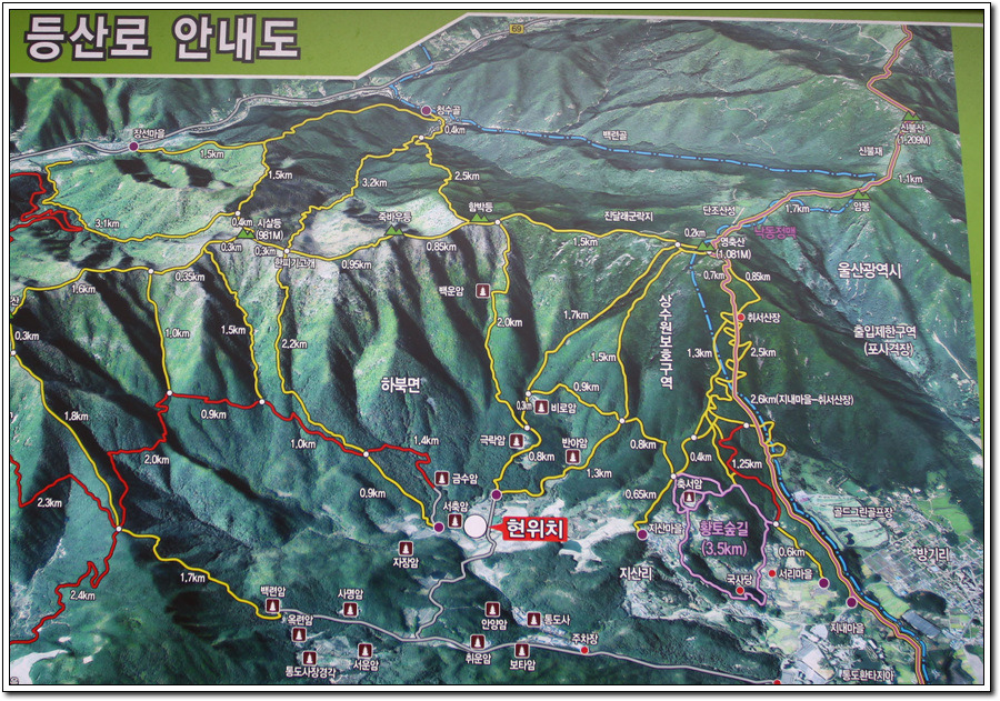 ♣ 행정구역: 들머리(배내재고개)-울산광역시 울주군 상북면 양등리, 날머리(통도사 주차장)-경남 양산시 하북면 통도사로 108