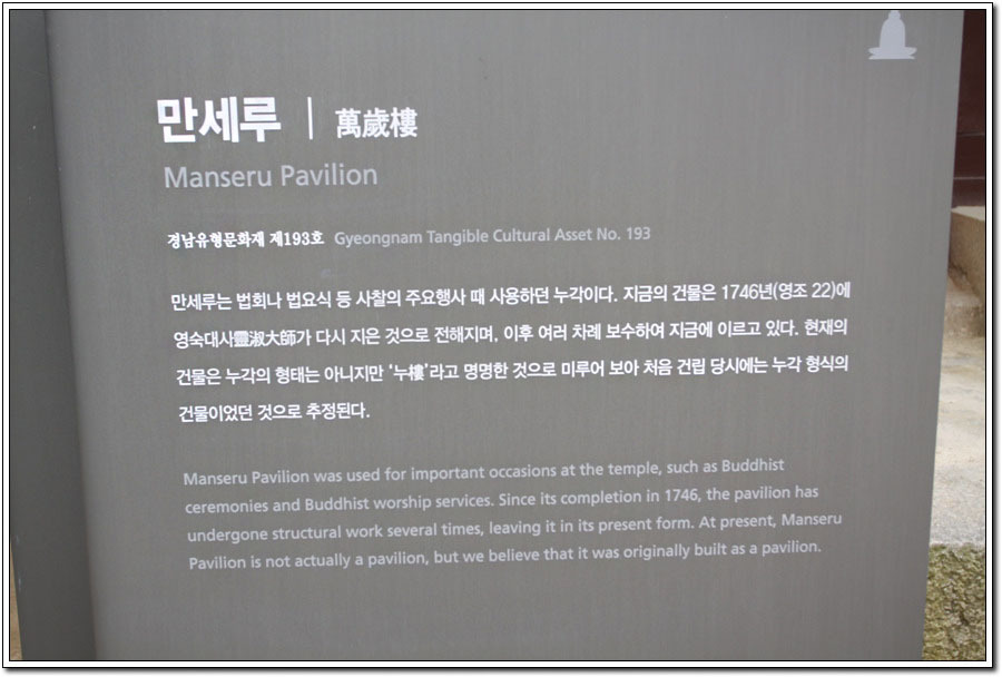 이 사찰은 부처의 진신사리를 안치하고 있어 불상을 모시지 않고 있는 대웅전이 국보 제290호로 지정되어 있으며, 이 밖에 보물 제334호인 은입사동제향로(銀入絲銅製香爐), 보물 제471호인 봉발탑(奉鉢塔)이 있고, 보물전시관에는 병풍·경책(經冊)·불구(佛具) 및 고려대장경(해인사 영인본) 등의 사보(寺寶)가 소장되어 있다. 소속 암자로는 선원(禪院)인 극락암을 비롯하여 백운암·비로암 등 13개의 암자가 있다. [출처:네이버 두산백과]