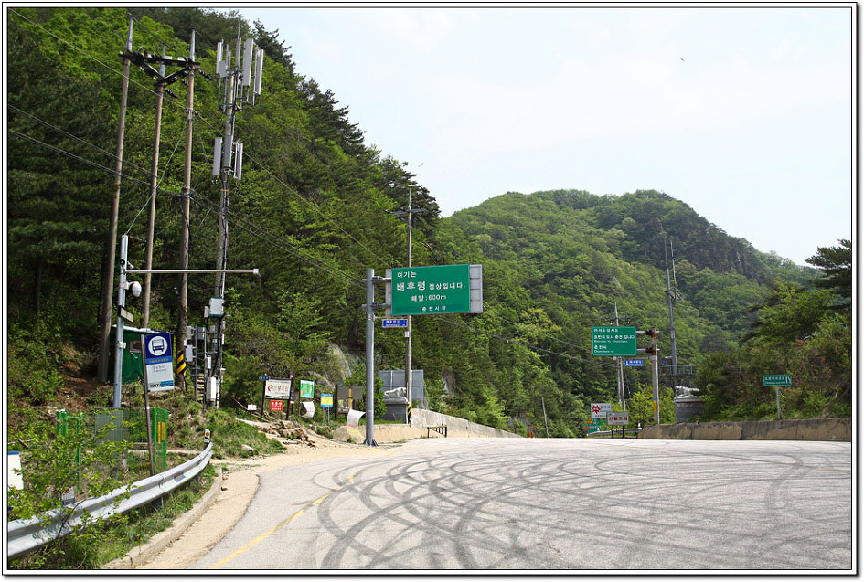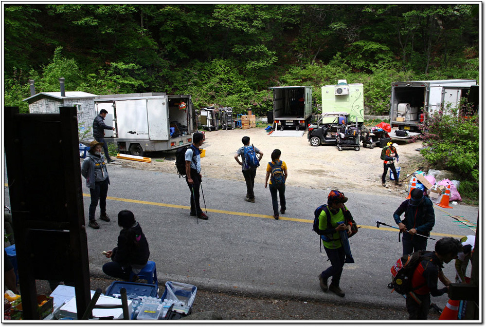 ▼ 들머리인 큰고개주차장까지 1킬로 남짓 근방에 다다르자 출입을 통제한다. 이유인즉, 주차장에는 영화촬영을 위해 이와같이 장비가 가득하여 버스를 돌릴 공간이 없으니 자신들이 제공하는 6인승 차량으로 들머리까지 옮겨타야 된단다. 우여곡절 끝에 20여분을 지체하고 산행을 시작한다.
