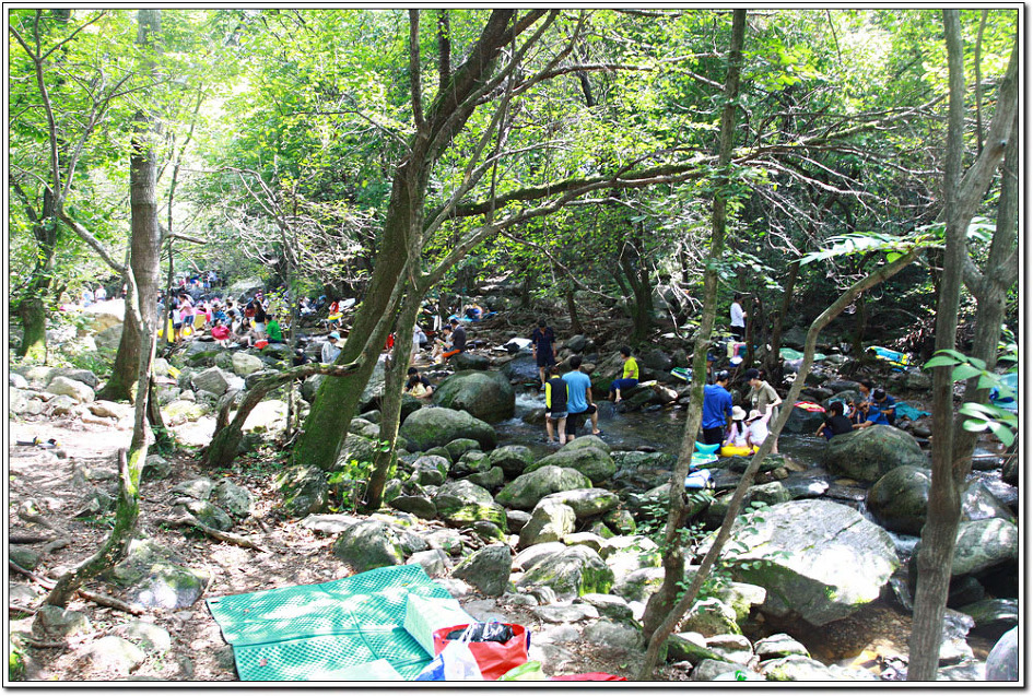 오늘은 너무 짧은 산행을 했다. 아니, 긴 코스를 정해 놓기는 했지만 삼겹살 파티를 즐기기 위해 오늘은 특별히 가볍게 산행하기로 한 것이다. 정상을 찍고 하산해서 계곡을 보니 수량은 제법 많은데 사람들로 북새통이다.