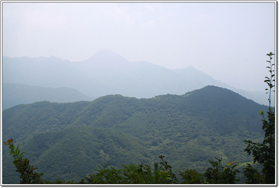 ▼ 원래 계획은 바로 앞쪽 봉우리인 어비산을 경유, 유명계곡으로 하산하기로 하였으나 무더위로 인해 유명산 능선으로 바로 하산하기로 한다. 어비산 넘어로 뾰족해 보이는 용문산 줄기인 천사봉(1004m)과 우측으로 최고봉인 용문산(1,157m)이 흐릿하나마 조망된다.