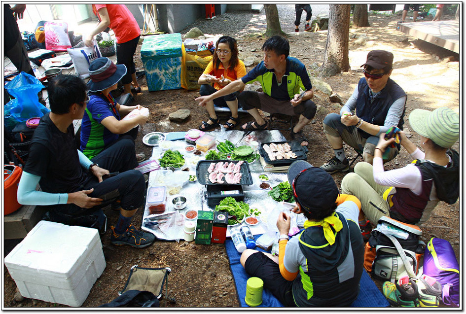 ▼ 하산하자마자 몸을 축이고 먼저 내려온 팀원들이 미리 준비한 삼겹살을 굽고 쌈, 주류등 음식들을 펼쳐 놓고 기다리고 있었다. 음식 맛 그야말로 good~~ 산행이 아닌 모두 피서온 기분이다. 아니, 피서가 뭐 별거 있는가! 이곳에서 두어시간 계곡물에 들락거리며 지내고 오니 무더위도 역시 즐기기 나름이다.