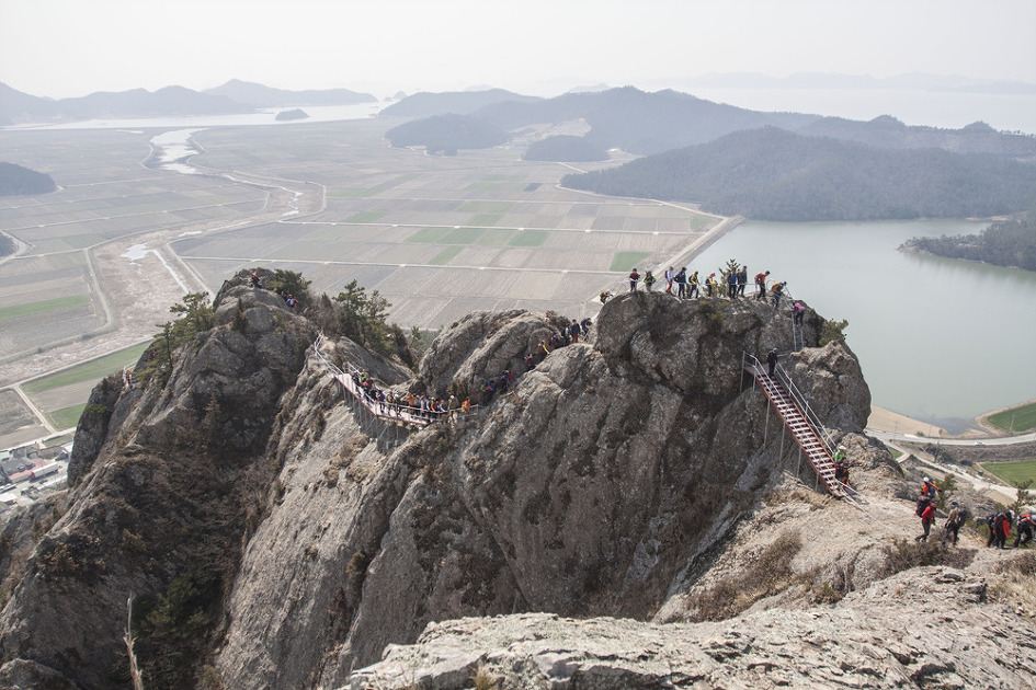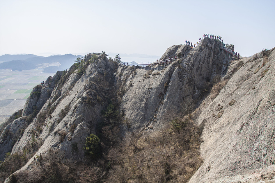 동석산이 아마도 입소문을 타고 많이 알려져서인지 도착하자마자 이미 들머리부터 정상으로 이어지는 끝없는 행렬은 동석산의 인기를 말해주는 듯 하다. 주로 암릉으로 이어져서 바위를 타는 스릴로 재미도 있지만 나무가 없어 좌우로의 탁트인 조망은 주변 다도해와 마을 전답과 멀리 두륜산까지 볼 수 있는 풍경이 있기에 지루한 줄 모르고 산행하게 된다.