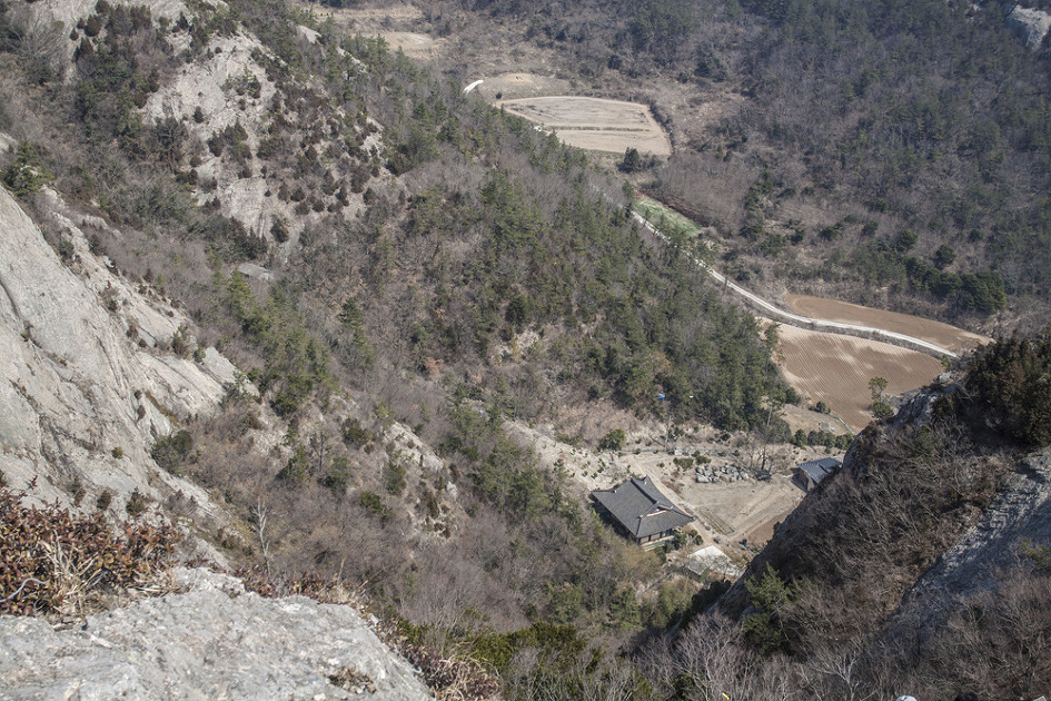 ▼ 암릉 왼쪽 중간쯤에 미륵좌상암굴이 보인다. 미륵불이라도 있는 줄 알았지만 없는데 이러한 명칭이 왜 붙었는지는 알 수 없다.