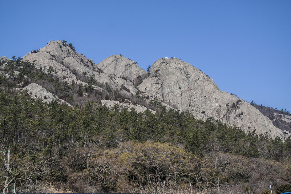 ▼ 버스에서 내리자 마자 펼쳐진 동석산 풍경인데 이렇게 한눈에 들어 올 줄은 몰랐다. 물론 북쪽으로 이어지는 능선이 이곳에서 보일리 만무지만 처음부터 암릉의 압도적인 모습에 마음이 설레인다.