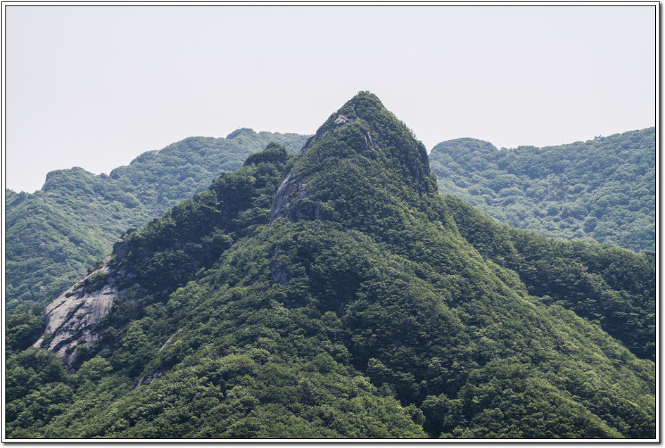 ▼ 만제재 부근에서 당겨 본 호미동산...호랑이 꼬리와 같다하여 붙여진 이름이란다. 마치 난공불락의 요새와 같다. 가학산도 오르면서 봉우리가 뾰족하게 보였는데 호미동산도 그렇게 보인다. 산이란 보는 각도에 따라 다르니 한쪽만 보고 느낌을 말한다는 것도 조심스럽다.