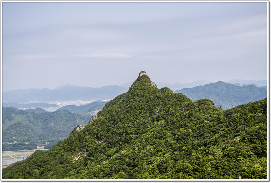 ▼ 망봉에서 바라보는 가학산 위용은 대단해 보인다. 저 뾰족한 봉우리를 넘어 진행하게 되는데 이렇게 봉우리가 뾰족한 산도 보기 드물다. 마치 진안의 마이산을 보는 듯한 느낌이다.