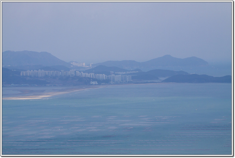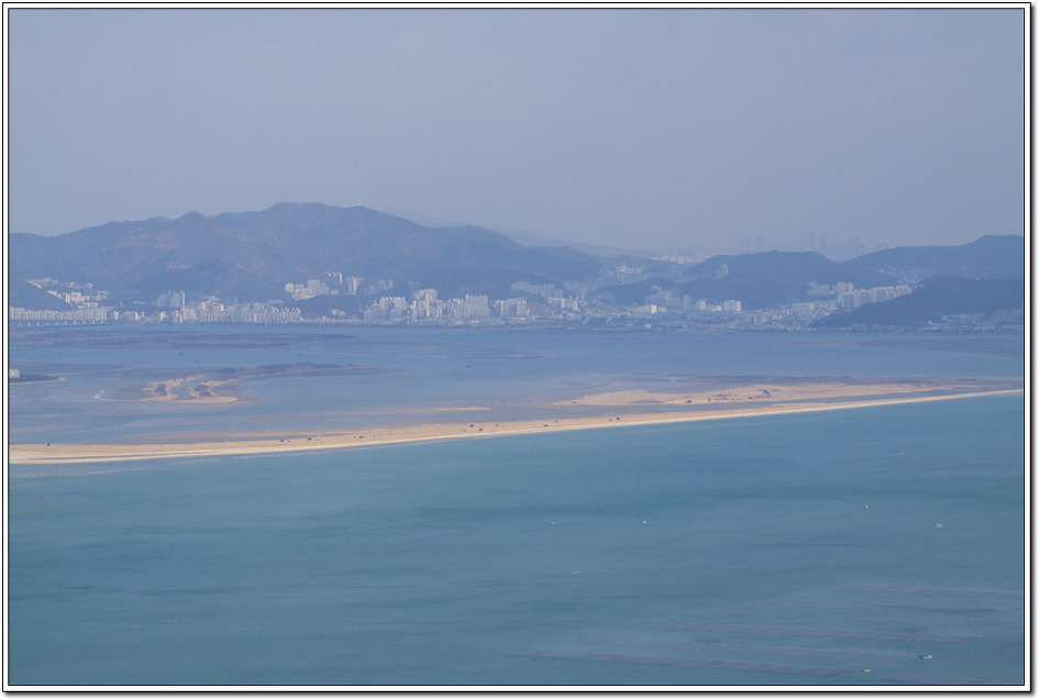 ▼ 신자도의 모래사장이 걷고 싶을 정도로 멋진 모습이다. 멀리 승학산과 시약산이 겹쳐 보이는 듯 하다.