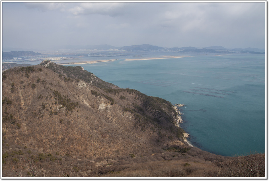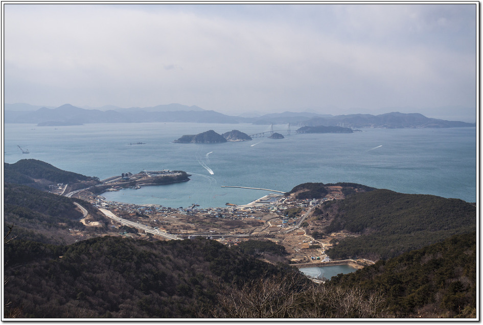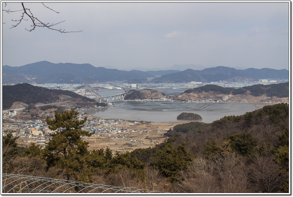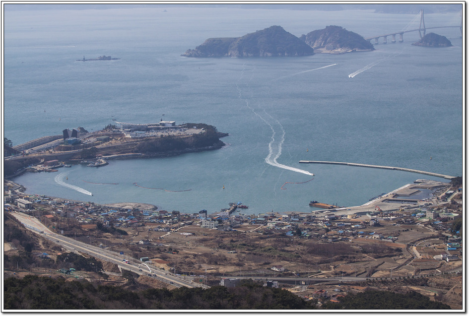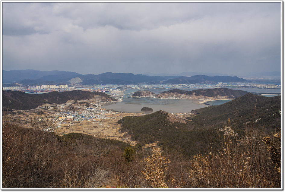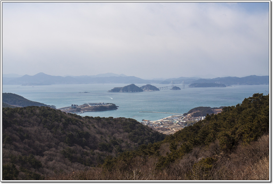 ▼ 첫 조망터에서 본 북쪽 방향의 눌차대교와 가덕대교... 왼쪽의 길마봉에 가려 엄청난 규모의 부산신항컨테이너부두가 보이질 않는다. 해안에 거미줄처럼 시커멓게 보이는 것은 굴양식장이다.
