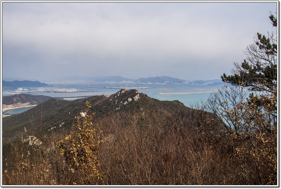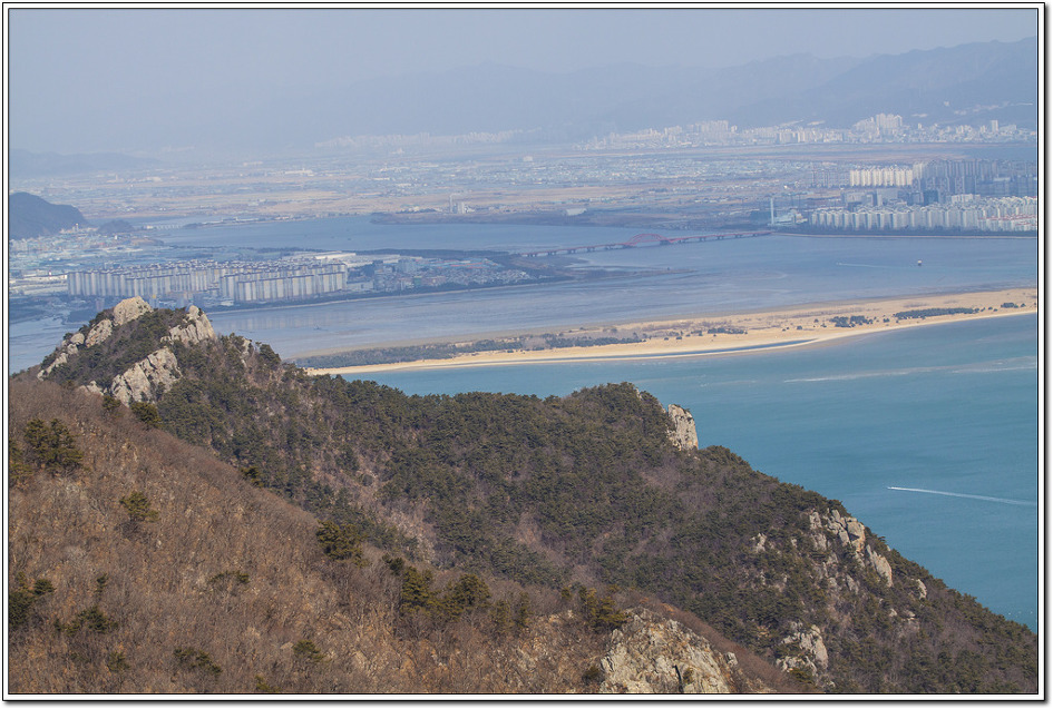 ▼ 왼쪽 응봉산 뒤로 모래섬인 진우도와 서낙동강 줄기의 신호대교, 멀리 부산진해경제자유구역이다.
