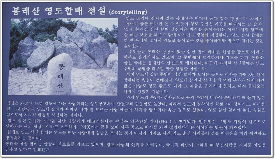 봉래산은 영도의 중앙에 자리잡고 있으며, 해발 395m의 높이를 가진 산이다. 전체가 대체로 원추형을 하고 있고 마치 봉황이 날아드는 것 같은 산이라 해서 봉래산이란 이름이 붙여졌다. 또한 봉래산은 신선이 살고 있는 아름답고 신비스러운 산이란 상징성을 갖고 있다.