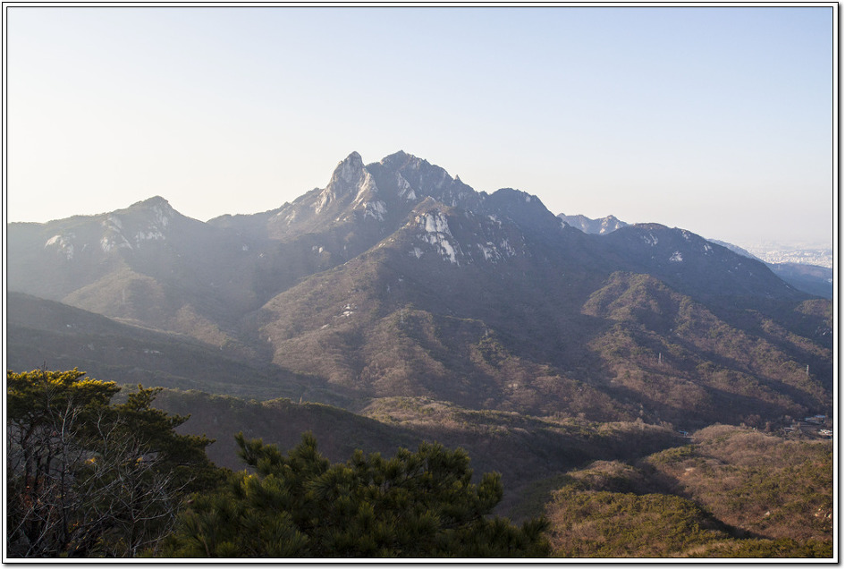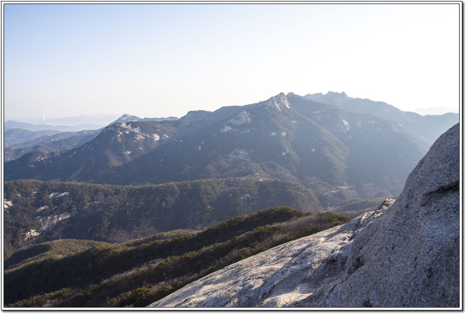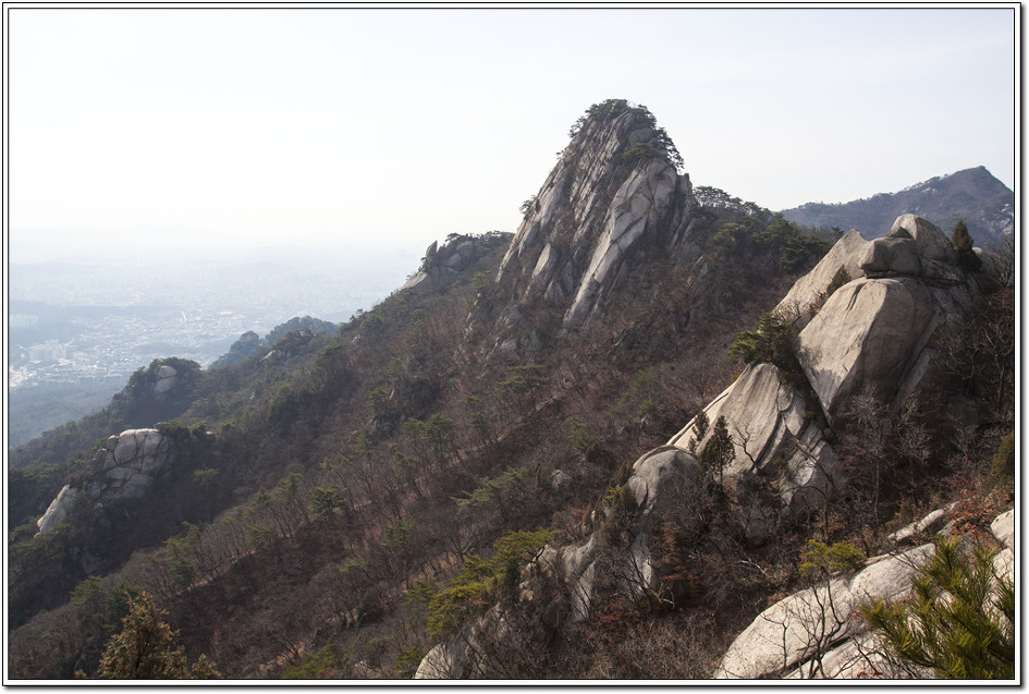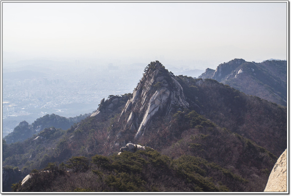 ▼ 북한산의 왼쪽 영봉, 인수봉, 백운대, 염초봉과 오른쪽으로 흐른 원효봉과 그 너머로 의상능선의 용출봉, 용혈봉, 증취봉이 살짝 보인다.