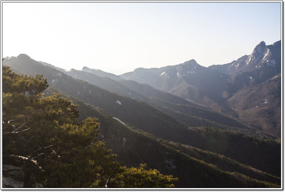 낮길이가 좀 길어진 듯, 한시간 좀 넘게 오르니 상장능선이 펼쳐지고 해는 이미 산 등성 위로 떠올라 눈 부시게 한다.
