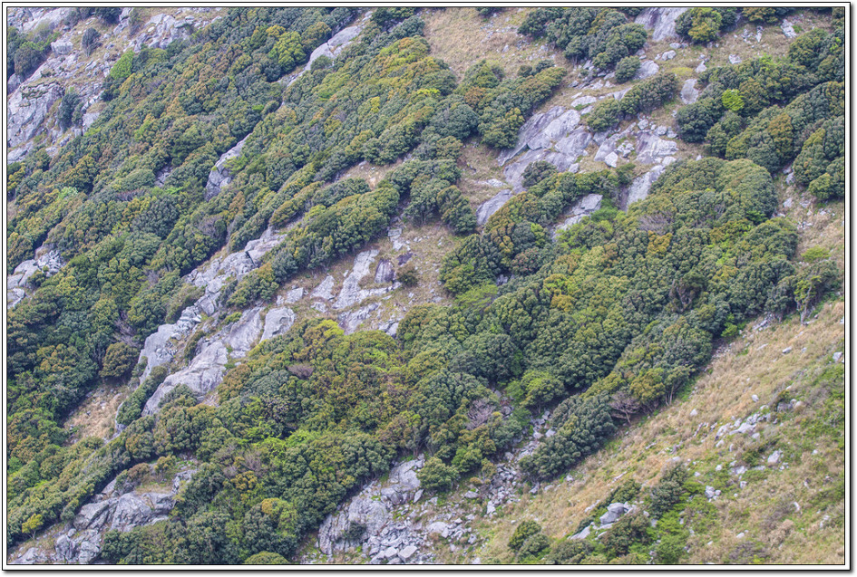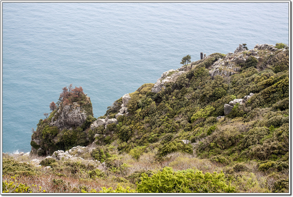 ▼ 장군봉까지 저 정도의 암릉은 가볍게 오를 수도 있지만 해품길을 벗어나면 안되겠기에 내려다 보이는 등로로 하산하였다가 오른다. 나중에야 안 일이지만 저곳에서 우측으로 하산하면 대항마을로 내려가게 되고 선착장인 당금마을로 이어진다.