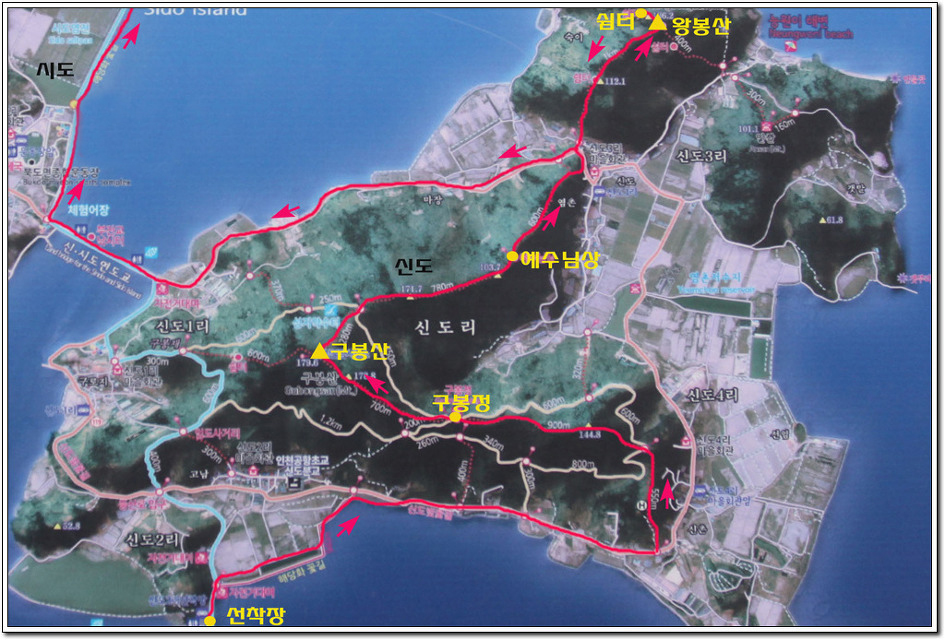 ♣ 트레킹코스: 선착장-신도벚꽃길-헬기장-144.8봉-구봉정-구봉산(179.6m)-예수님상-왕봉산-신시도연육교-해당화꽃길-개절-슬픈연가드라마 촬영지-수기해변-수기전망대-한국전력공사-시모도연육교-배미꾸미조각공원-박주기-해당화꽃길-버스정류장