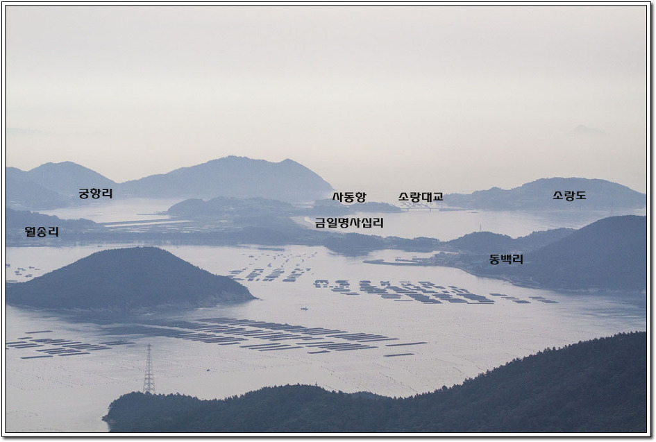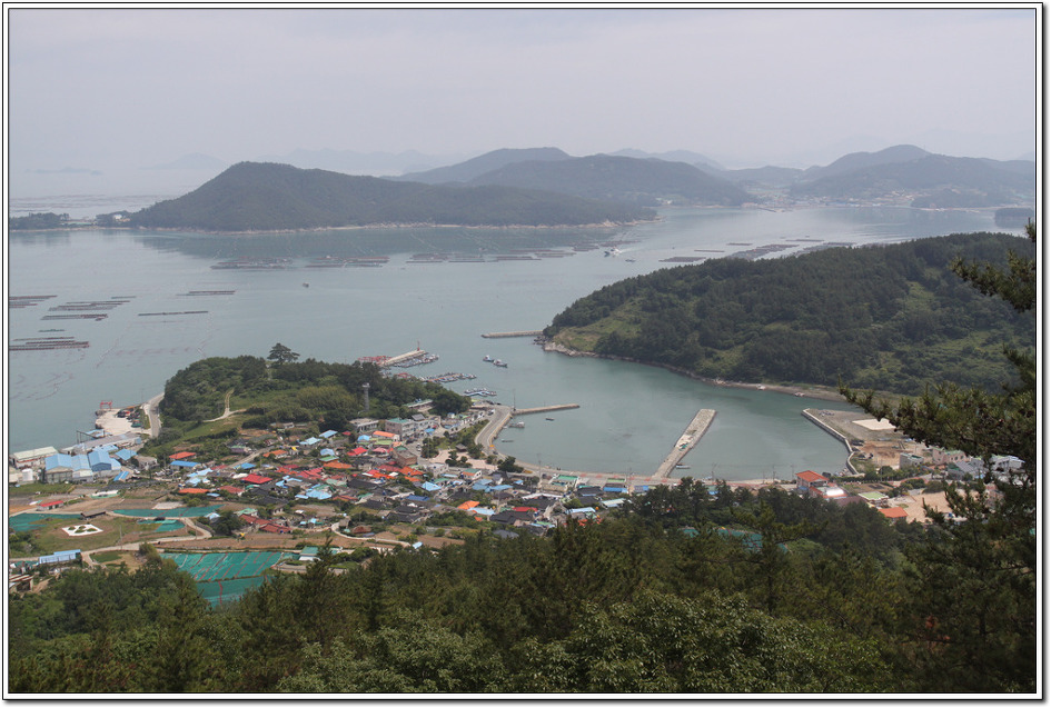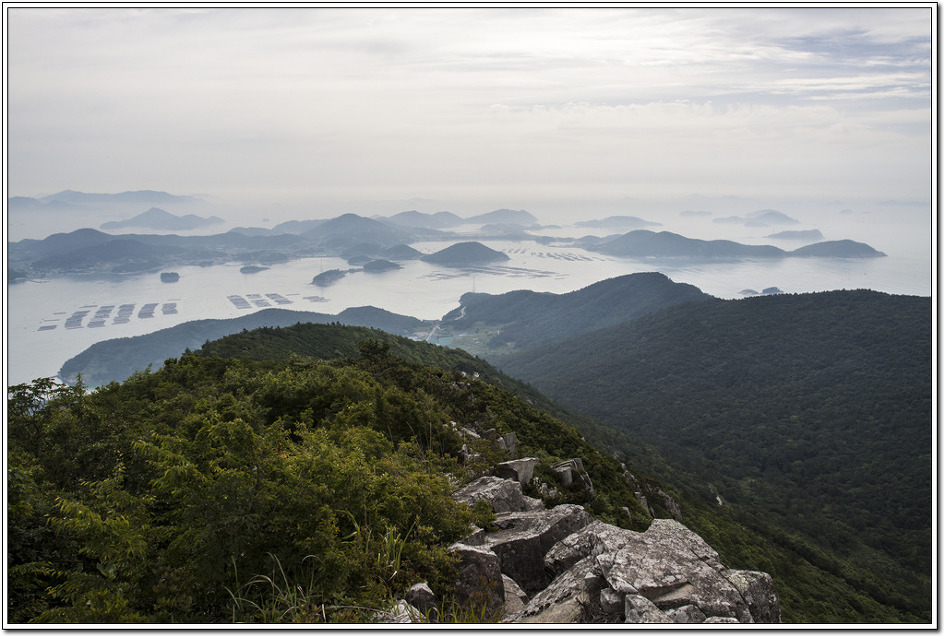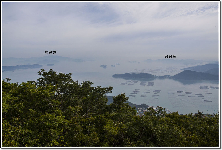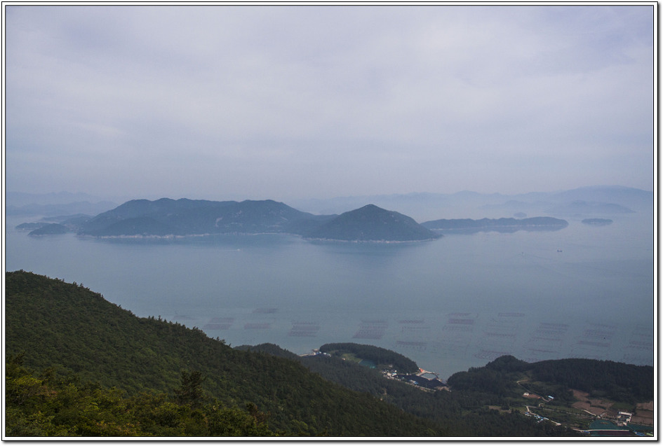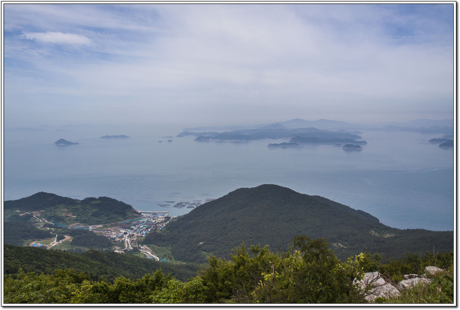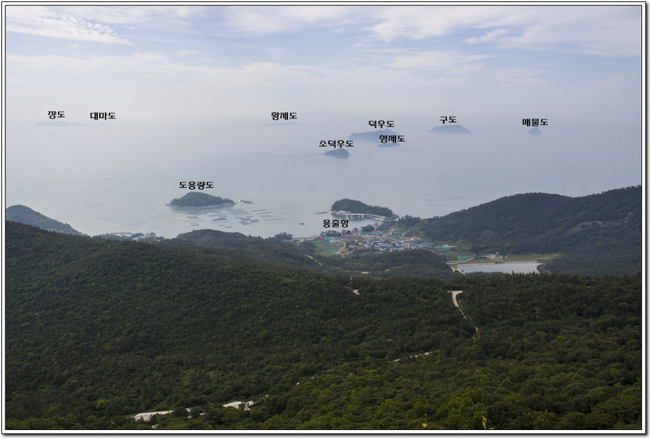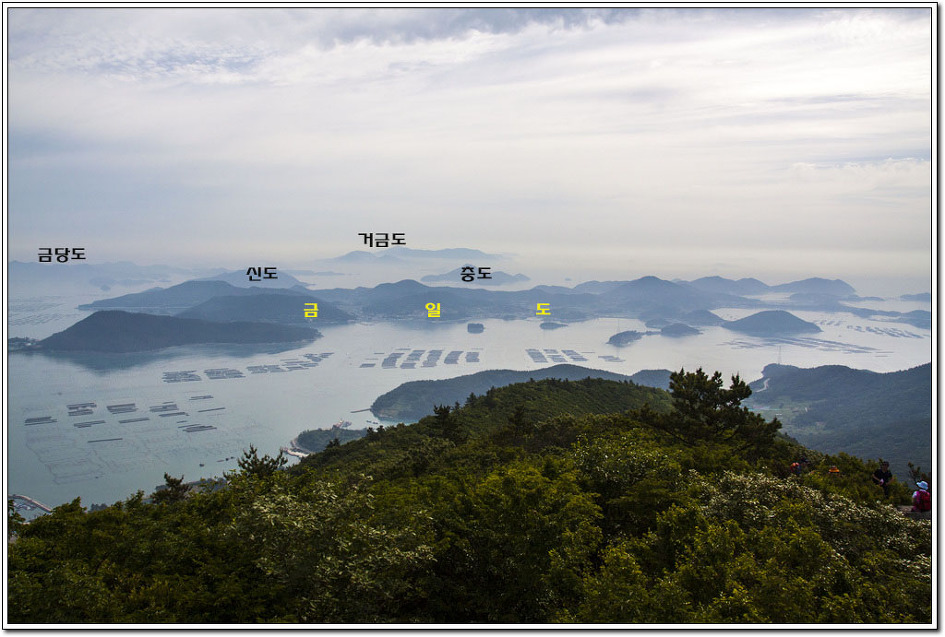 ▼ 남쪽으로 고개를 돌리면 올망 졸망 작은 섬들이 점점이 떠 있는 모습이 마치 징검다리 같다. 흡사 사량도에 와 있는 착각을 불러 일으킨다.