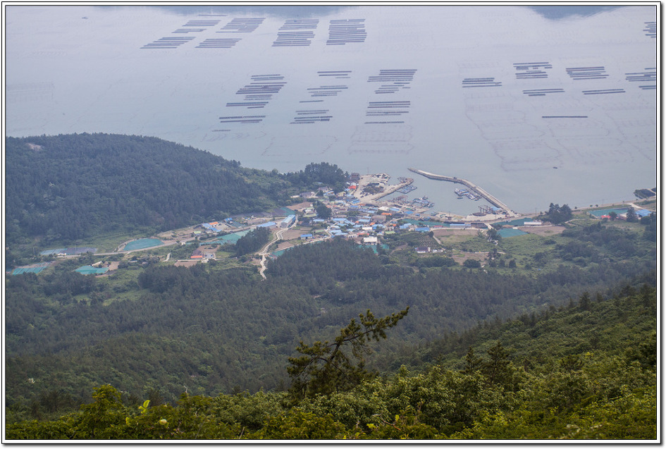 ▼ 조약도(약산도)의 당목항이 있는 전경 모습. 앞에 볼록 나온 산은 공고지산, 뒤로 길게 늘어서 능선상엔 오른쪽에서 왼쪽으로 장용산, 삼문산(망봉), 토끼봉으로 이어지고 오늘 오후에 걸을 산행지이기도 하다.