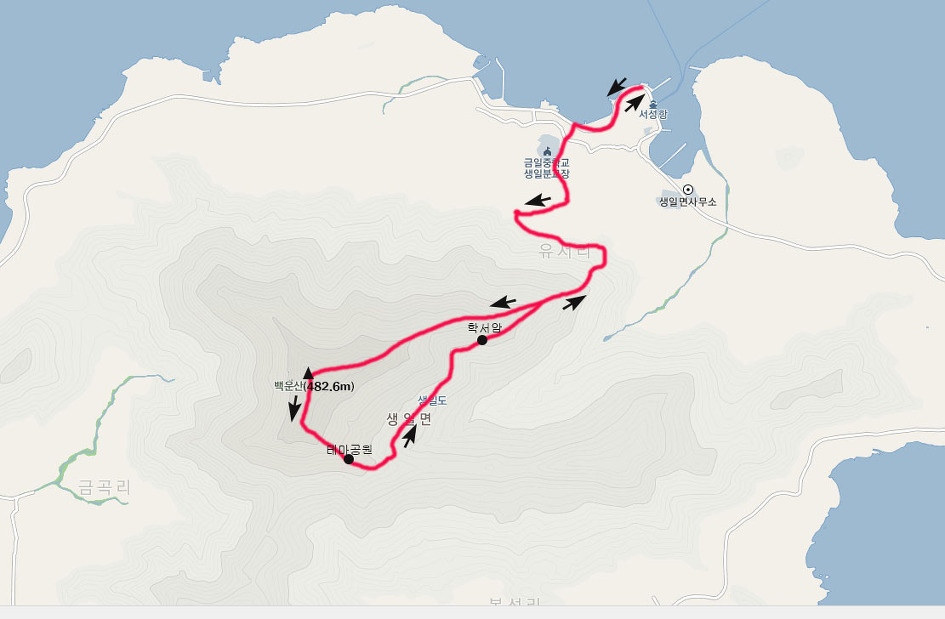 ♣ 행정구역: 들,날머리-전남 완도군 생일면 유서리(서성항), 백운산 정상- 완도군 생일면 금곡리