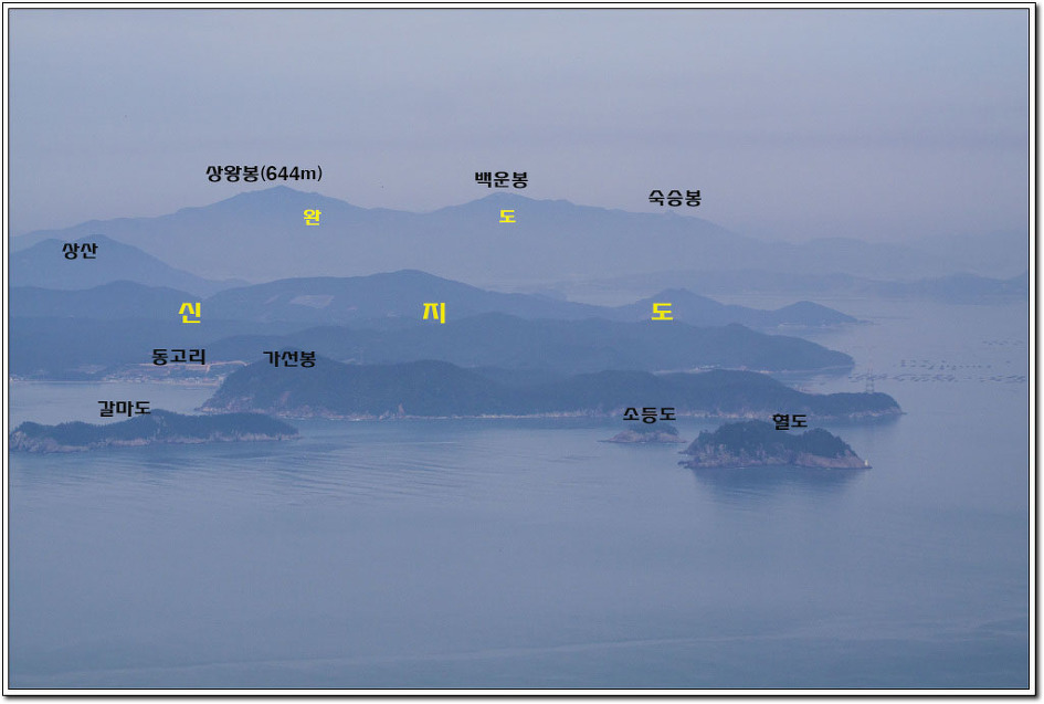 ▼ 정상에서 점심을 먹고 북쪽을 바라보니 신지도와 그 뒷편으로 완도의 상왕봉, 백운봉, 숙승봉이 아스라히 보인다. 언젠가 꼭 오르고 싶은 곳이다.