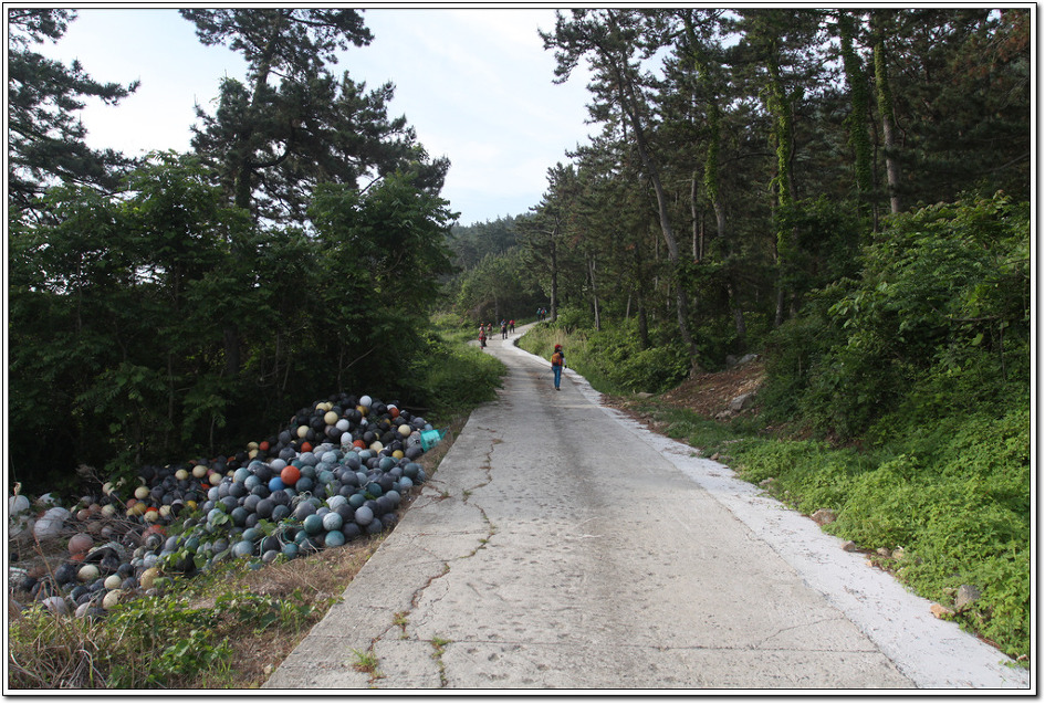 ▼ 선착장에서 300여 미터 산모퉁이를 돌자 유서리 마을이 보이고 들머리가 시작되는데 마을 어귀에는 다시마를 말리기 위해 햇볕에 널어 놨다. 그물망으로 덮어 놓은 것은 바람에 흩어지지 않도록 고정하기 위한 것 같다.
