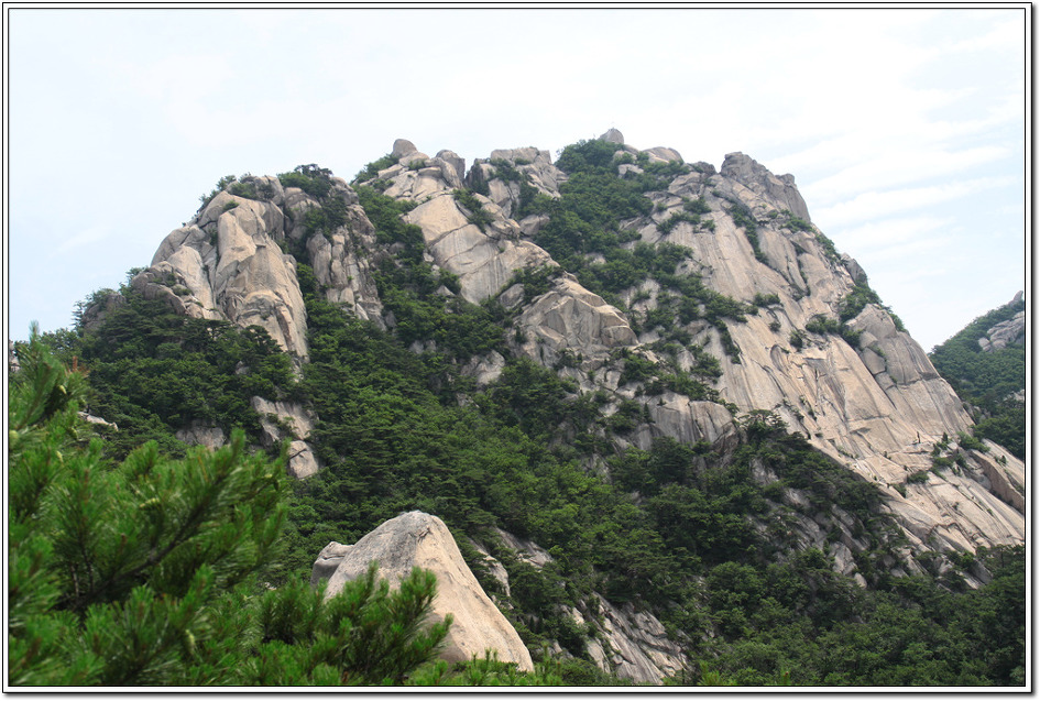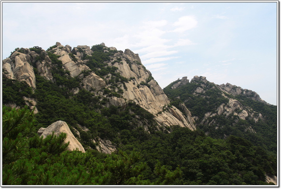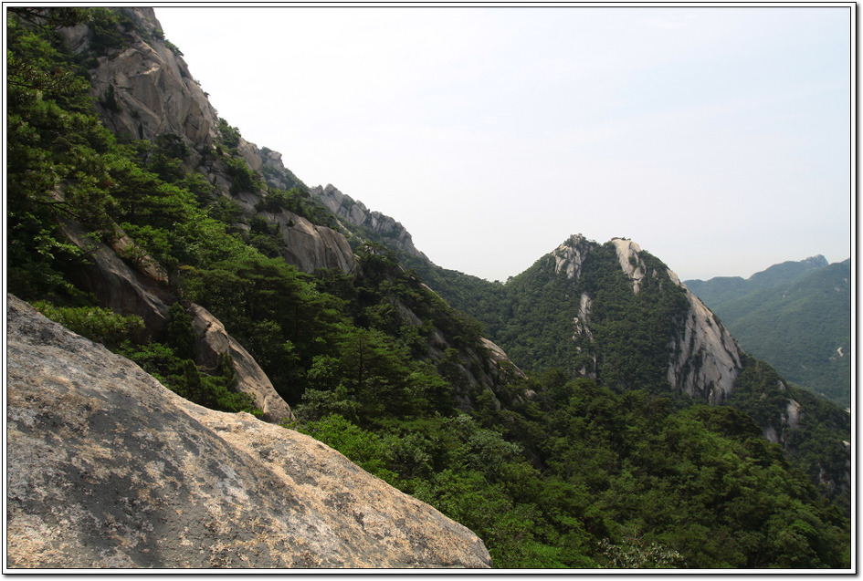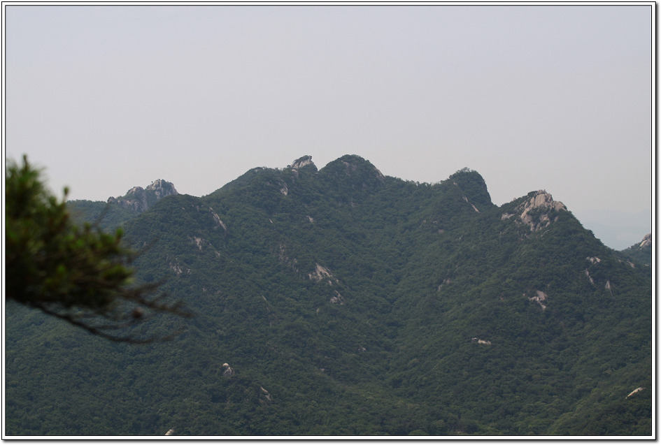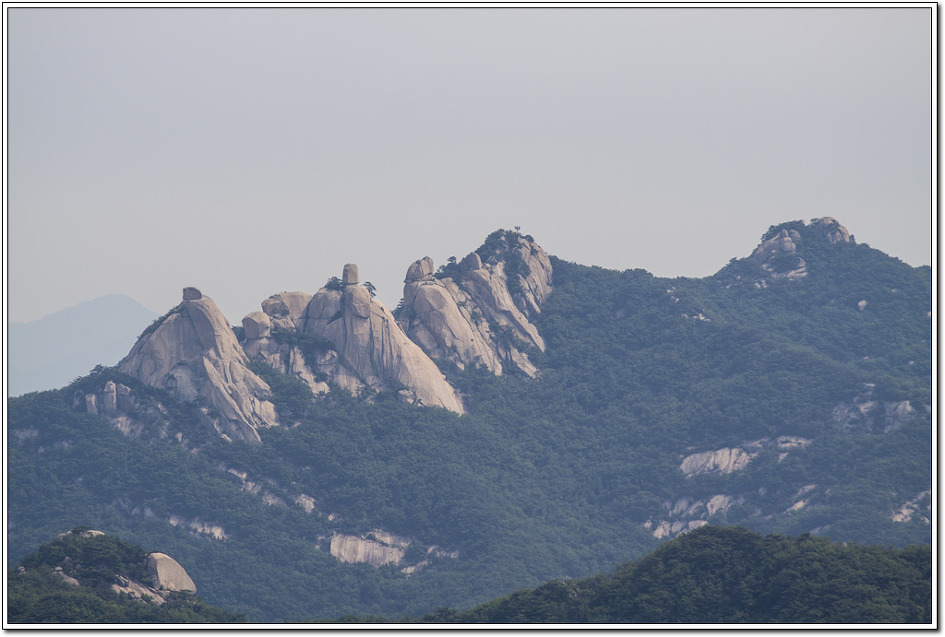 ▼ 백운대로 부터 흘러내린 암릉은 가운데 용암봉이 살짝 보이고 오른쪽으로 노적봉의 동봉과 서봉이 눈앞에 펼쳐졌다.