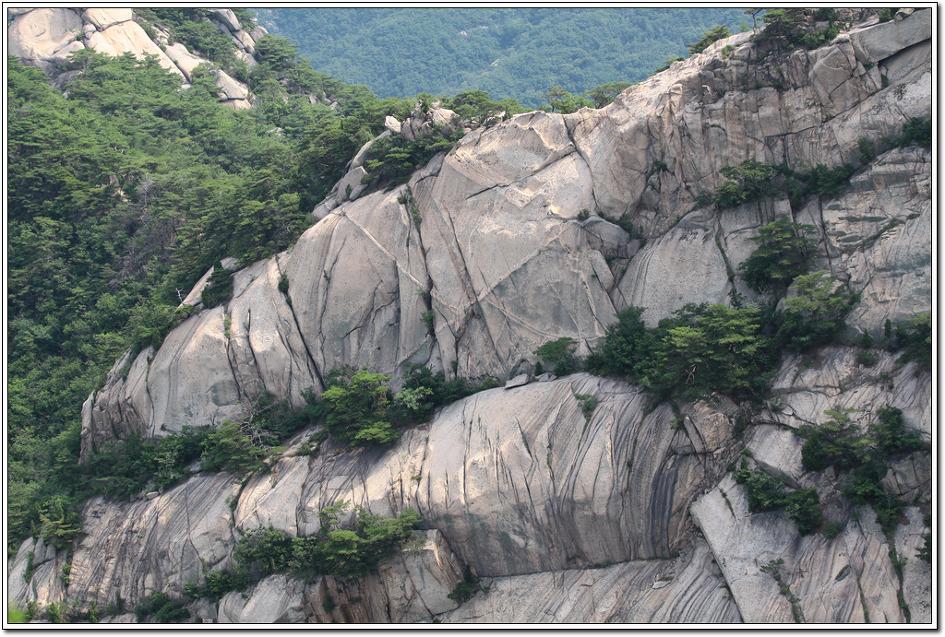 ▼ 저곳에서 이곳 파랑능선을 볼 때는 오르지 못할 험준한 지형으로 생각했었다. 그러나 이곳에서 숨은벽을 보니 까마득한 절벽의 암릉을 실감할 수 있다.