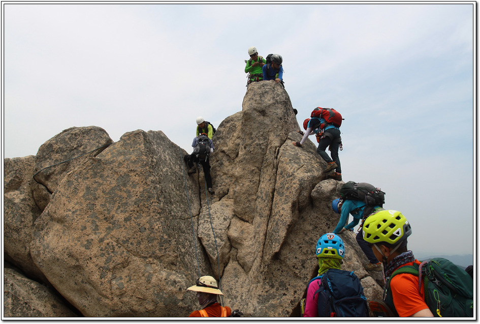 ▼ 앞쪽 바위의 오른쪽에 홀드가 많은 바위가 있다. 피아노란 의미는 홈이 많아 피아노 치듯 밟고 오르내리는 의미로 붙여진 듯 하다. 많은 인원들이 한사람씩 내려오려면 시간이 너무 지체되어 양해를 구하고 즐풍님은 그냥 릿지로 오르고 나는 안전상 그들이 설치한 자일을 이용하여 올랐다. 카메라를 가방에 넣고 등반 준비하는 바람에 근접촬영 못한게 아쉽다.