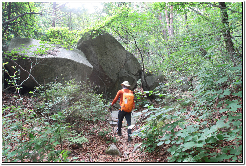▼ 책바위를 넘어 이제 부터는 별로 어려움이 없는 암릉으로 하산하여 계곡으로 접어들면 된다.