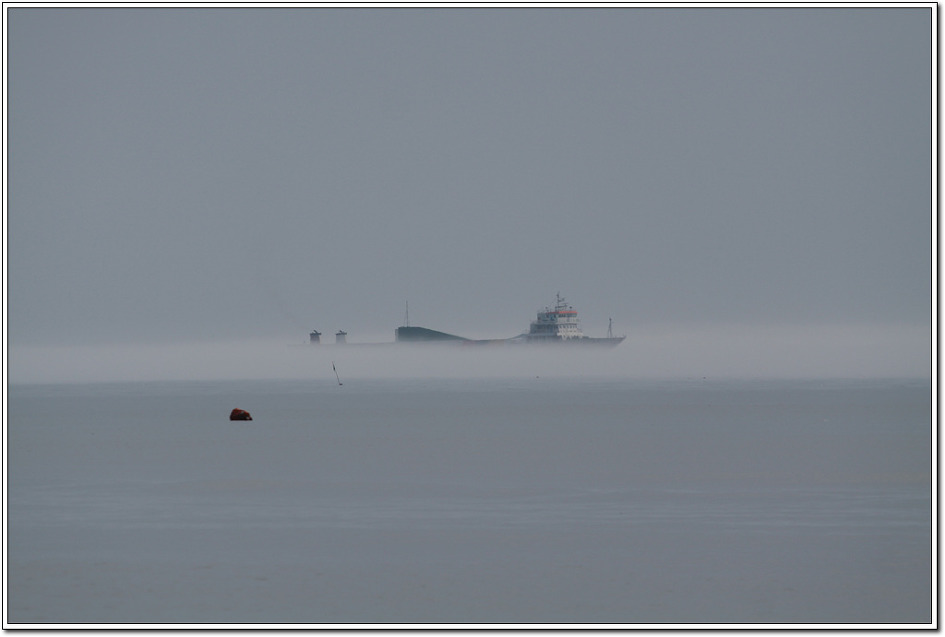 ▼ 해변을 지나는 화물선이 해무에 쌓여 파도에 묻힌 듯 보인다.