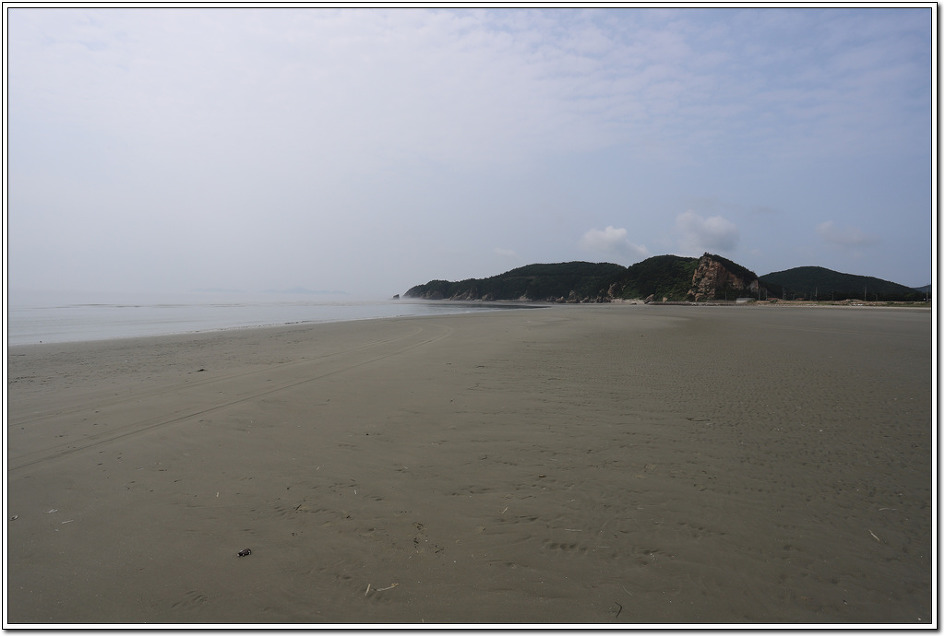 ▼ 유리의 원료인 규암가루가 쌓인 토질이니 보기에는 진흙 같아도 빠지지도 않고 신발에 달라 붙지도 않는데 이러한 넓은 해변에 서 있기만 해도 평온한 느낌을 받는다. 해수욕장이 너무 넓어 왠만한 인파에는 표시도 안날 것 같다.